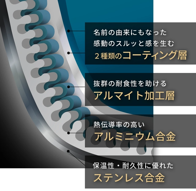 2層構造でも、従来のアルミ1層構造に比べ、十分に蓄熱力も高まり、従来の使いやすさも維持できると判断し、SURUTTO PROは、2層構造が採用されることになりました。