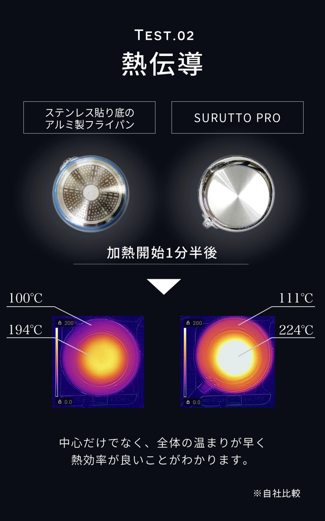SURUTTO PROの外面は全面ステンレス構造。IHでの温まりに関して、優れた熱伝導性を発揮することが分かります。