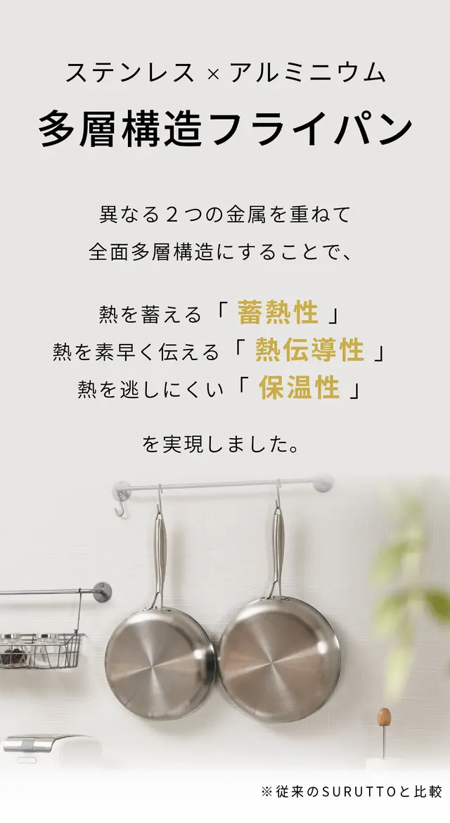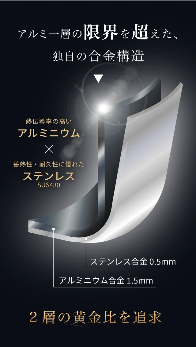 それを「熱しやすく、冷めやすい」アルミニウムと重ねて全面多層構造にすることで、両方のメリットを組み合わせた「熱しやすく、冷めにくいフライパン」になりました。
