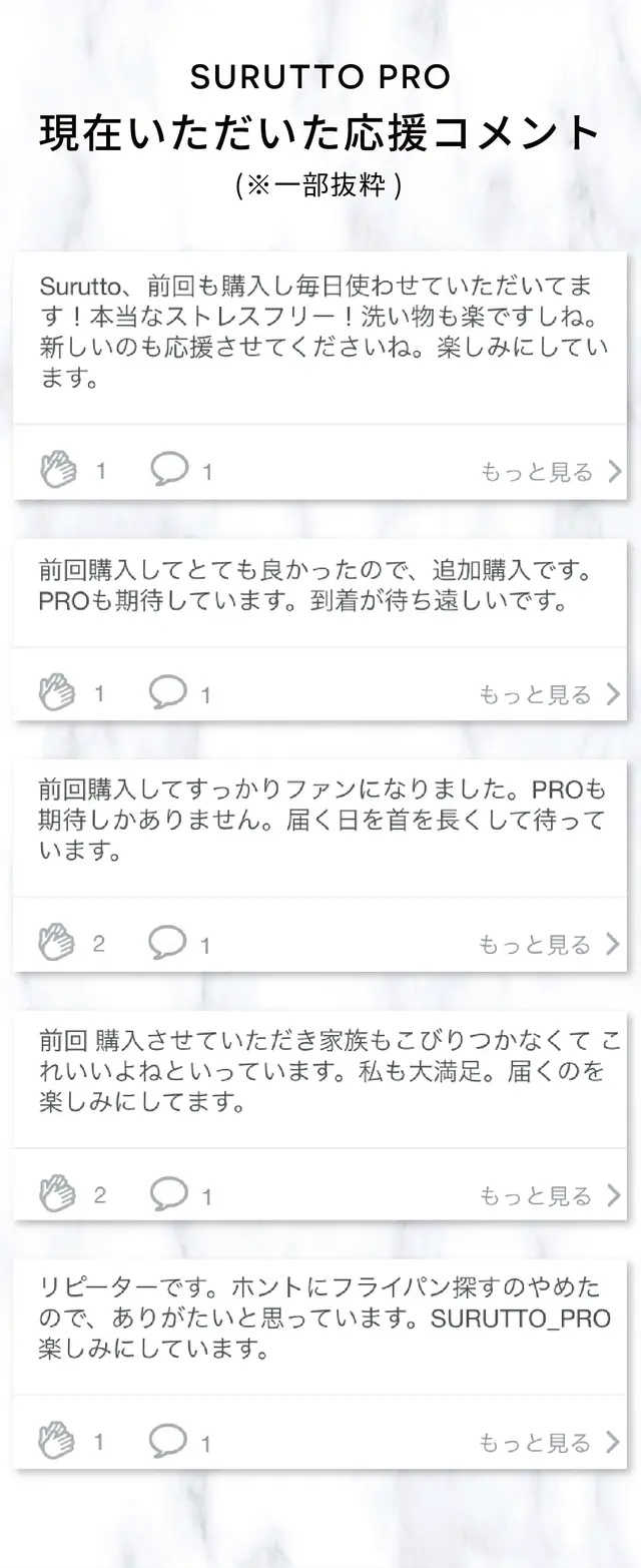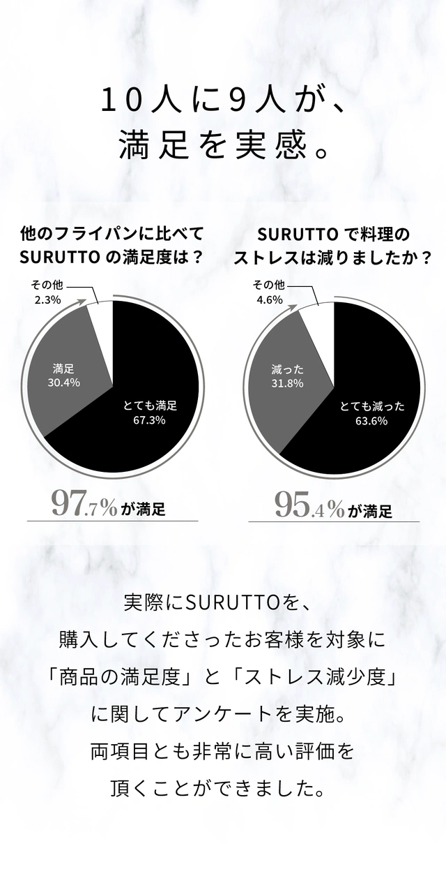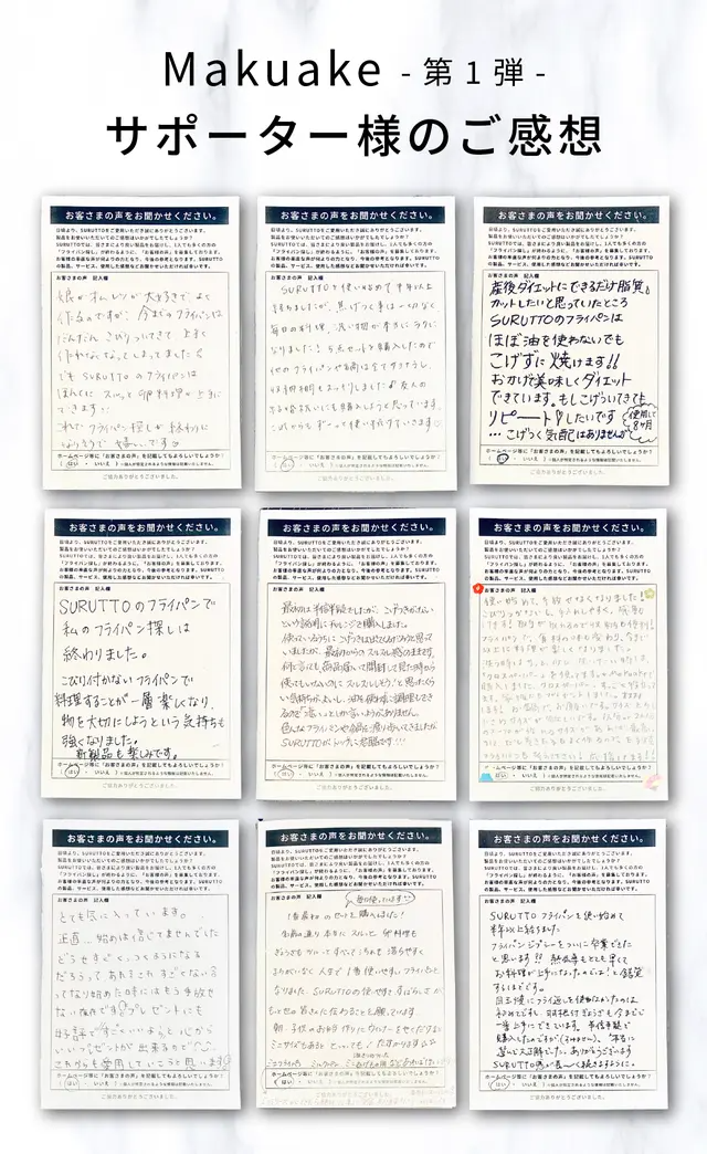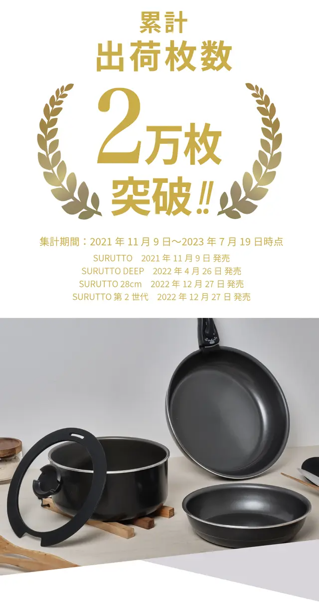 どこに、どのように感動するのかというのは、人それぞれポイントが違うと思いますが、SURUTTOが目指している感動は「使いやすい!」「こんなに使いやすいフライパン初めて!」という感動です。