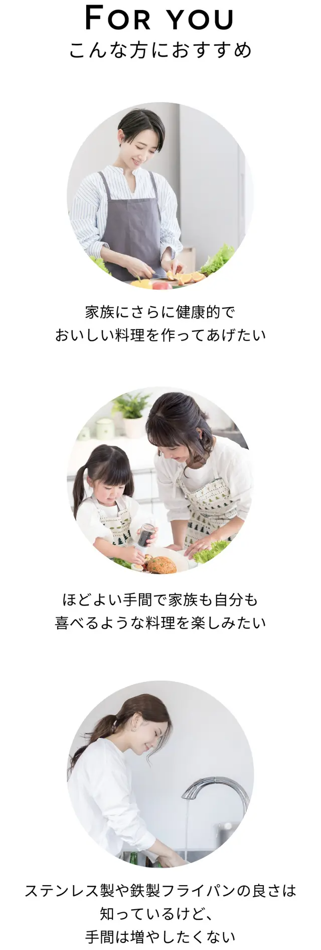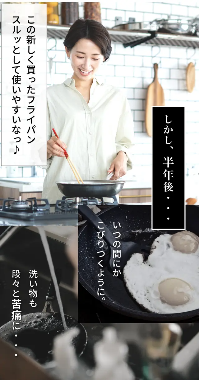 柔らかいスポンジと中性洗剤だけで、面倒なフライパン洗いが、まるで「お皿を洗うかのような手軽さ」になります。