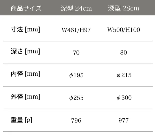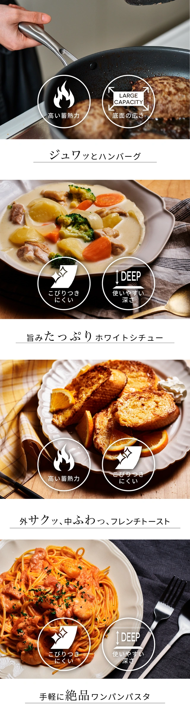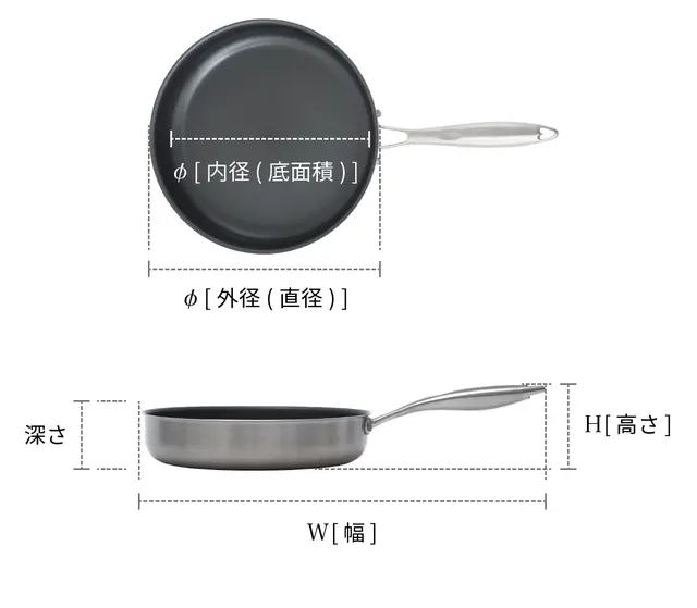 フライパン3サイズ、深型フライパン2サイズとも焼面を広く設計されています。