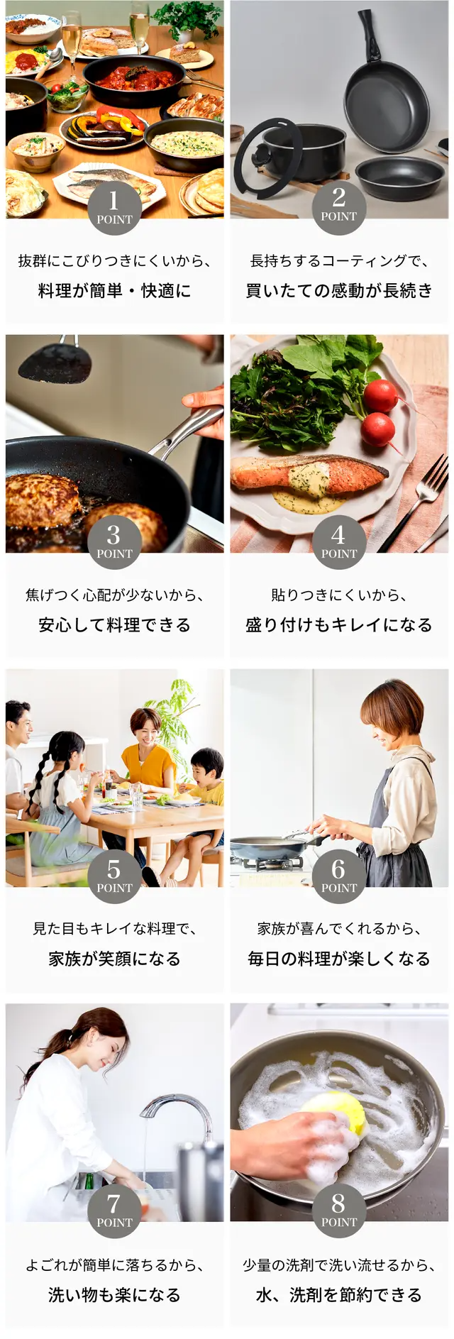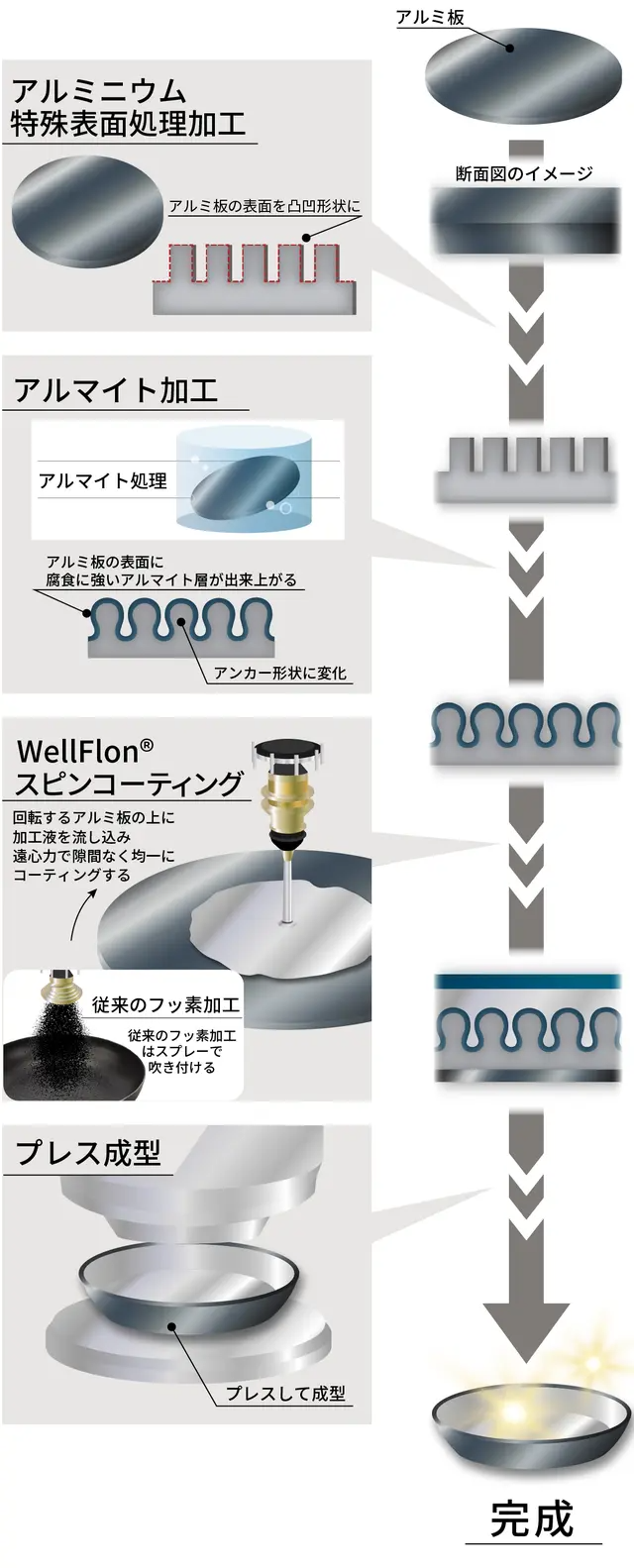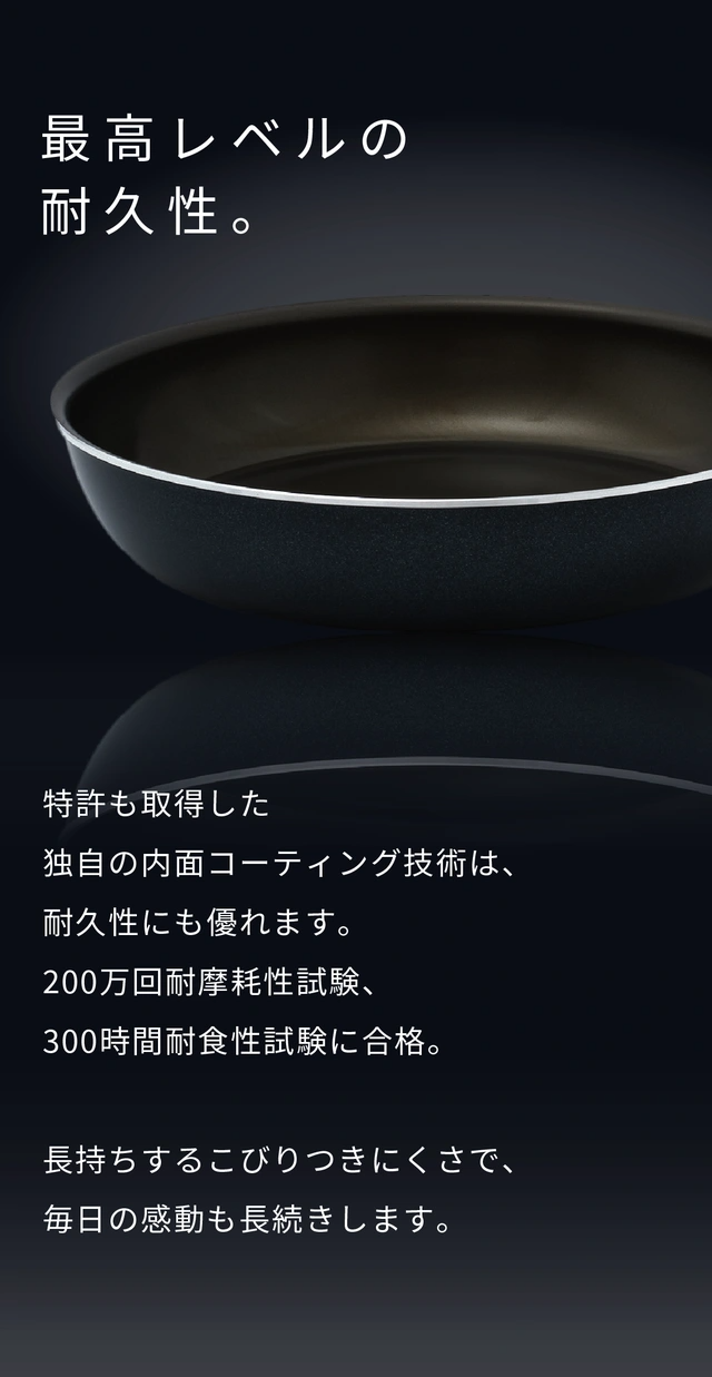 粒子をスプレーで吹き付ける従来の加工ではなく、液体を流し込む新しい加工方法により、鏡のような表面を実現し、食材もスルッと快適に調理することができます!