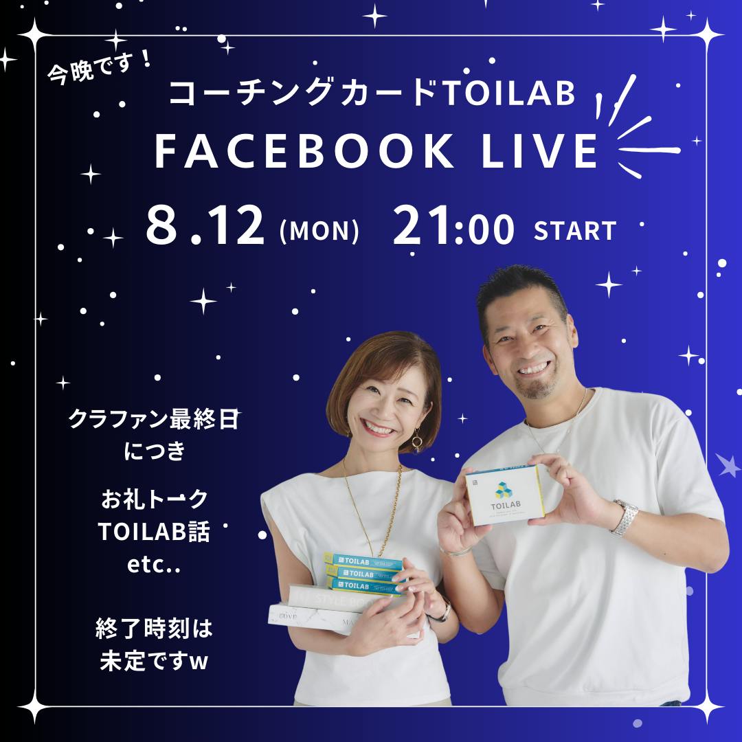 2024/08/12 20:46こんばんは!コーチングカードTOILABです。本日、いよいよクラファン最終日!なんと、皆様の応援のおかげで、本日クラファンサイトCampfireのランキング総合4位に掲載されておりました!プロダクト部門では、1位!!!!ご支援、応援、本当にありがとうございます!急なご案内となりますが、この後21時から、クラファンのお礼とTOILABトークとあと、最後の最後、クラファンの行方を見守るfacebookライブを開催します。(終了時刻は未定)どうしよう、私とかっちゃんと、2人でどれだけ喋れるのかw色々心配ですが、ラスト走り切ります!以下のタイムラインで配信しますので、お耳が空いている方、少しのお時間でも、お気軽にお越しください^^https://www.facebook.com/katsutoshi.sakamotohttps://www.facebook.com/yukiko.funabashiどうぞよろしくお願いいたします! もっと見るクラファンもラスト2日!いよいよTOILAB英語版が到着!