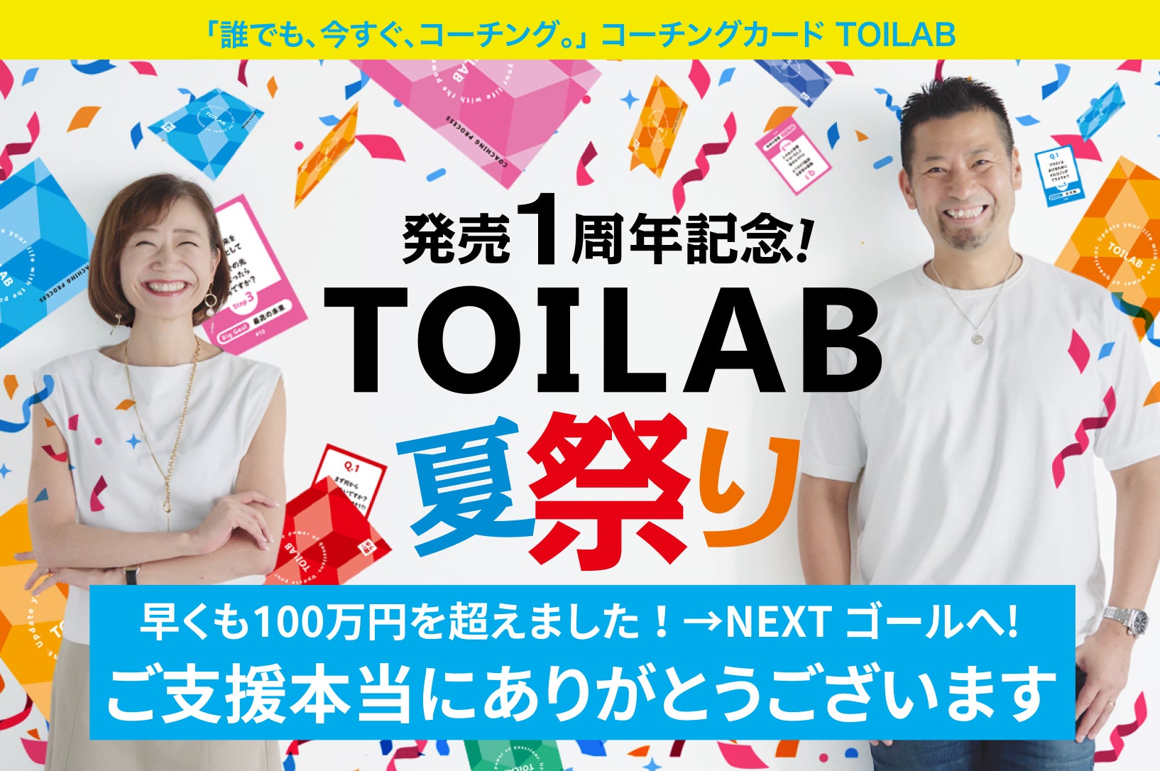 サポーター(ご支援者)のみなさまこんにちは!コーチングカードTOILAB開発者の坂本&船橋です。クラファン開始早々サポートをいただき、本当にありがとうございます!そしてこの度、おかげさまで早くもご支援100万円を超えることができました!重ねてありがとうございます〜〜〜!感謝の気持ちでいっぱいです!ただ!!!今回の【TOILAB夏祭り】の目的は、支援金額の達成ではありません。TOILABに込めた想いを本文に書かせていただいており、その一部を再掲させていただきます。****ただコーチングって、誰か特別な人だけのものじゃなくていいと思うんです。人の話を聞く、相談に乗ってあげる、これって、コーチに関わらず誰しも経験するシチュエーションです。そんな時、ちょっとでも相手にとっていい関わりができたら、幸せじゃないですか。「誰でも、今すぐ、コーチング。」 この世界を叶えていきたいのが、TOILABの想いです。****上記の想いの元、一人でも多くの人にTOILABを通じたより良いコミュニケーションが広まっていくことを目指して、ネクストゴールを設定しました!具体的には、ご支援人数200名/ご支援金額200万/TOILAB200セットを目指します。引き続き、どうぞよろしくお願いいたします!なお、ご支援いただいたリターンに関する詳細などは、順次ご連絡させていただきます。もう少々お待ちくださいませ!