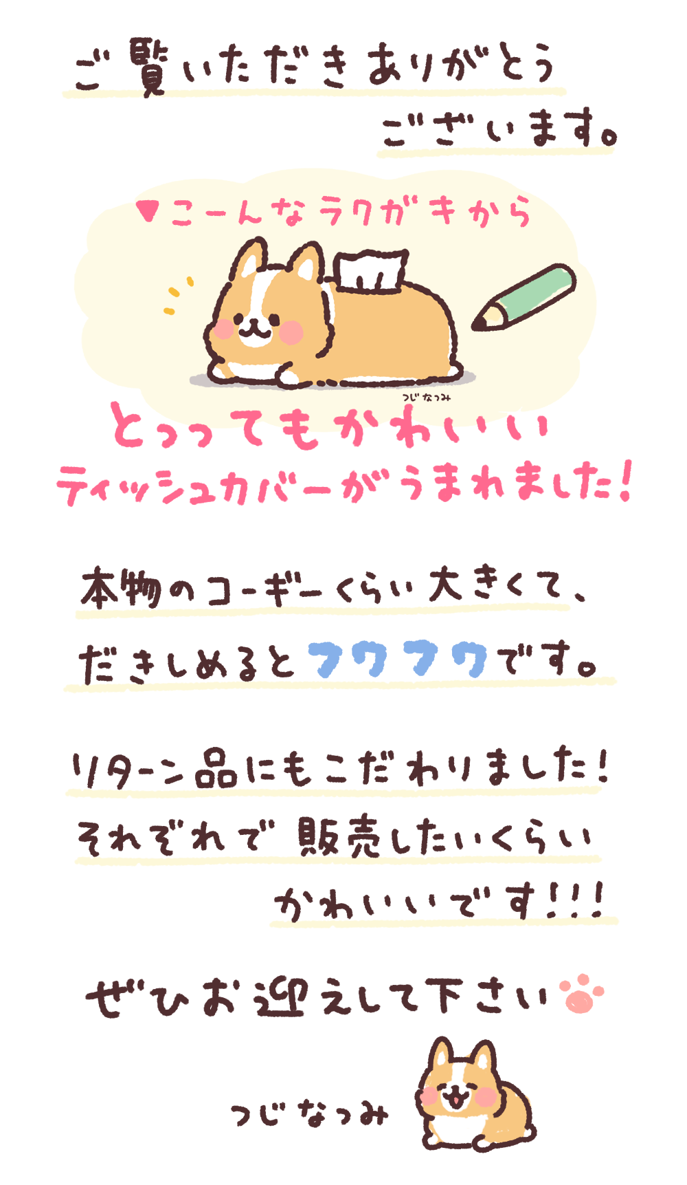 2024/07/09 12:33『「まるまるコーギー」ぬいぐるみティッシュカバープロジェクト』へ沢山のご支援誠にありがとうございます!ご支援の受付は【明日7/10(水)23:59まで】で終了となります。まもなく〆切ですので、ご検討中の方はお申込みそびれのないようぜひ余裕を持ってお手続きいただければと思います。ぬいぐるみティッシュカバーをはじめ、つじなつみ先生デザインのリターン品の数々をどうぞこの機会にお手にとっていただけると嬉しいです!6月よりスタートした本プロジェクト。企画開始からサンプル試作を何度も重ね、たくさんの時間をかけて辿り着いたふわふわのコーギーさんを皆様の元へお届けできる日を楽しみにしています!よろしくお願いいたします! もっと見るストレッチゴール達成ありがとうございます!