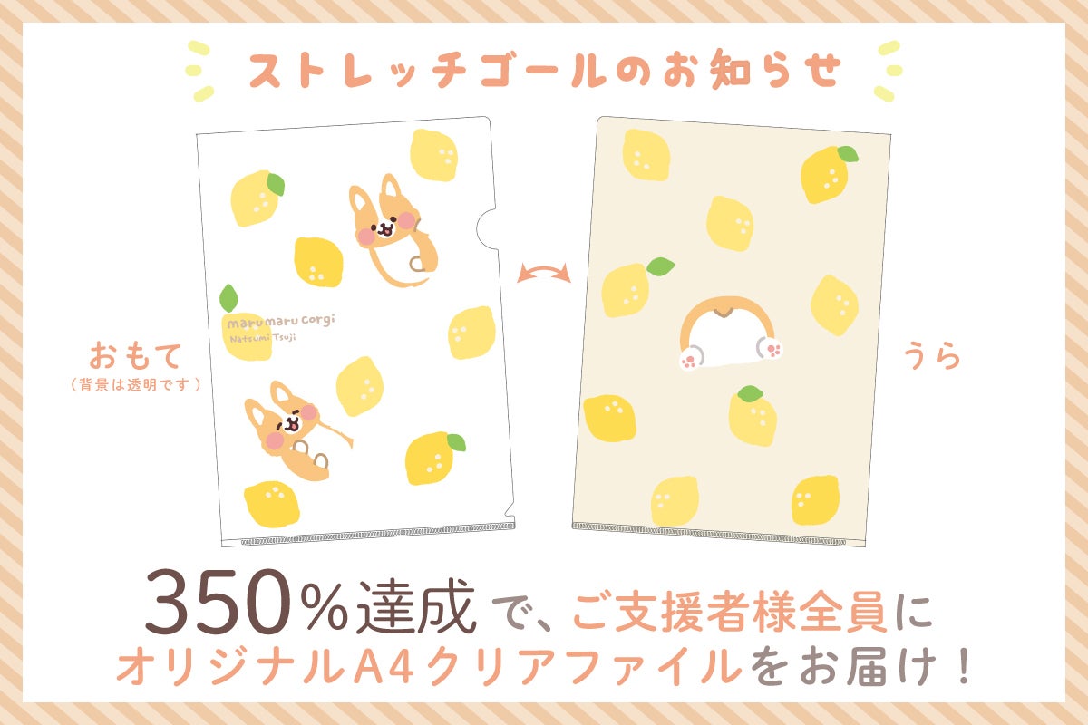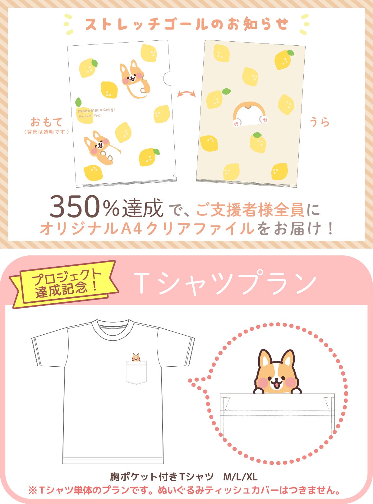 2024/07/02 12:38この度「まるまるコーギー」ぬいぐるみティッシュカバープロジェクトのストレッチゴール(第二目標)として掲げていた350%を達成しました!多くのあたたかいメッセージとご支援をありがとうございます!目標達成いたしましたので、ご支援者様全員へオリジナルA4クリアファイルをお届けいたします。クリアファイルは、お申込みいただいたプランのリターン品へ同梱の形で発送いたします。お届けは少し先となりますが、ぜひお楽しみに!ご支援の受付は7/10(水)23:59まで。(もちろんこれからお申込みの方にもクリアファイルが届きます!)ご検討中の方はどうぞお忘れのないよう、余裕を持ってお申込みいただければと思います。引き続き何卒よろしくお願いいたします! もっと見る