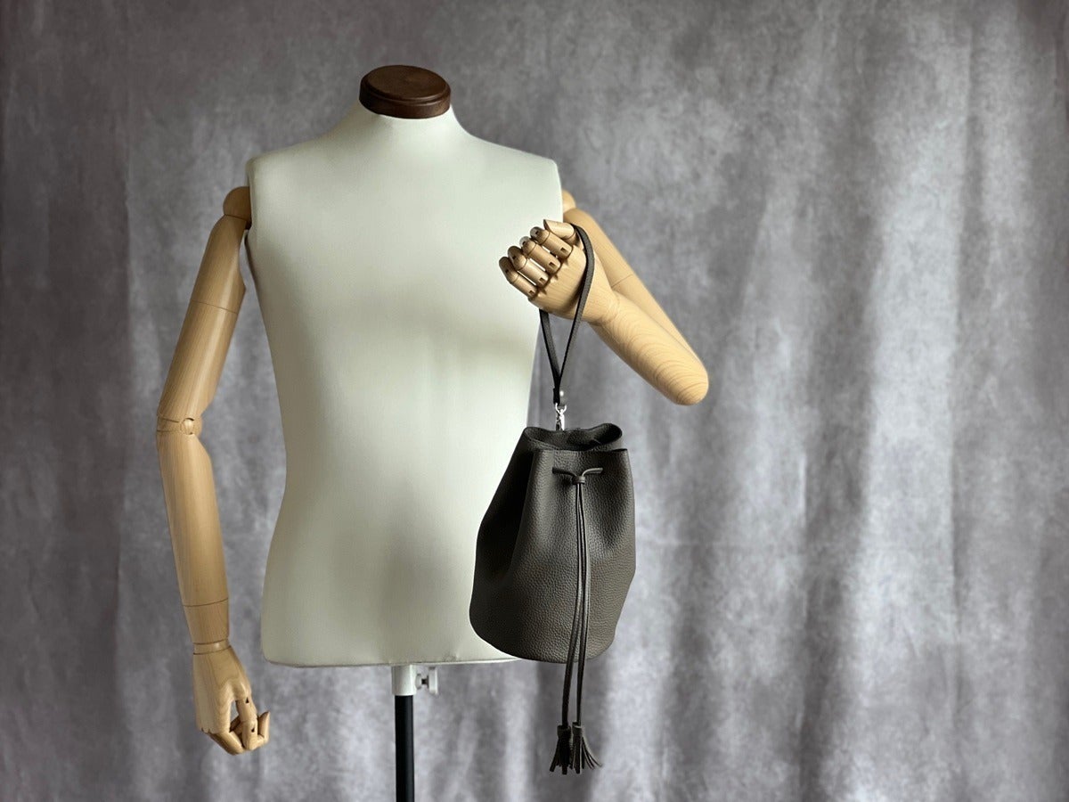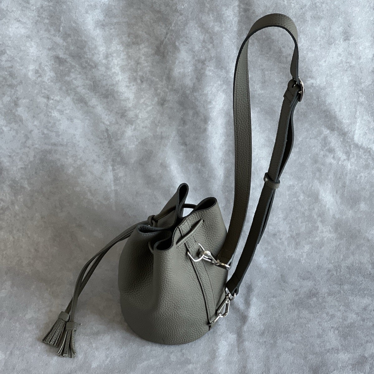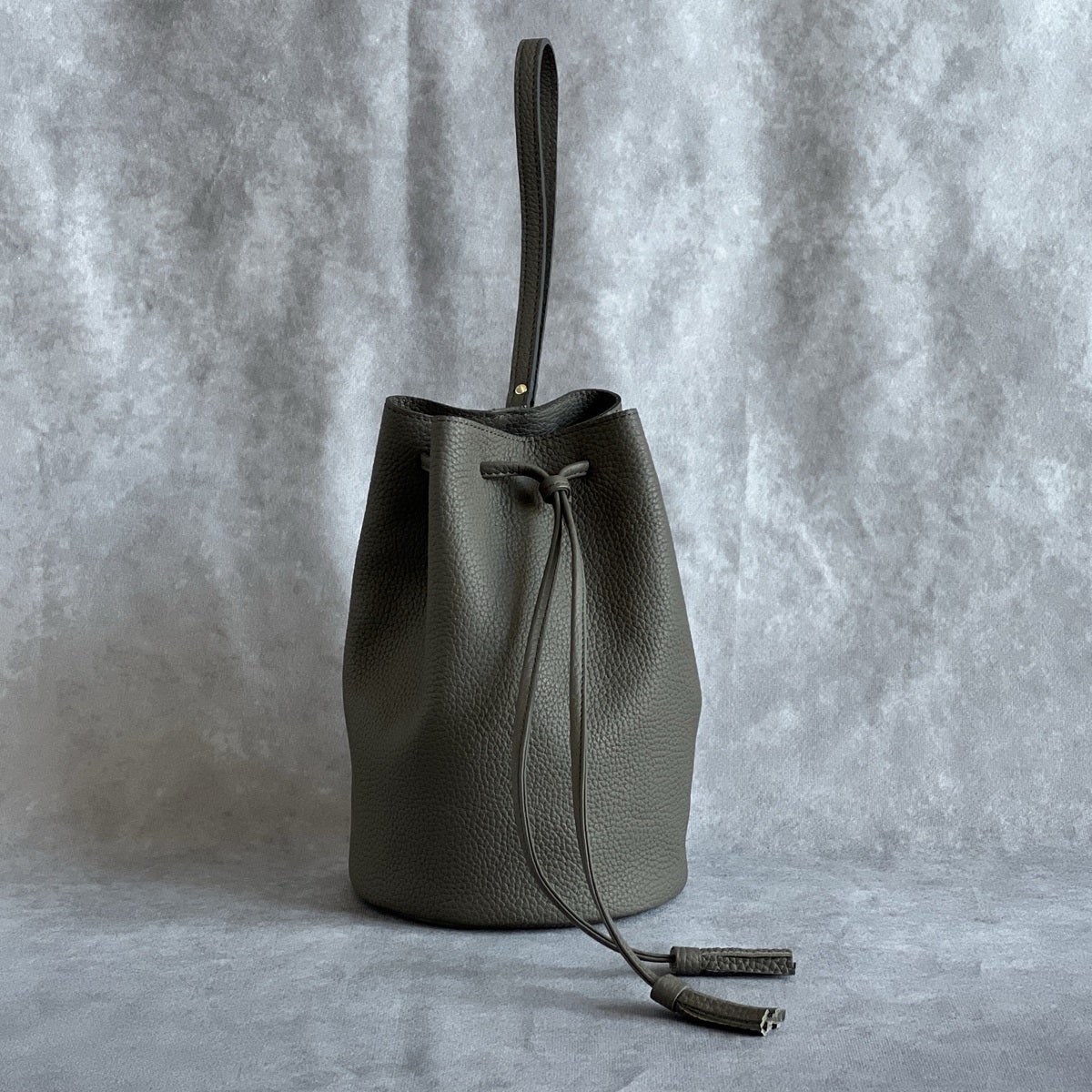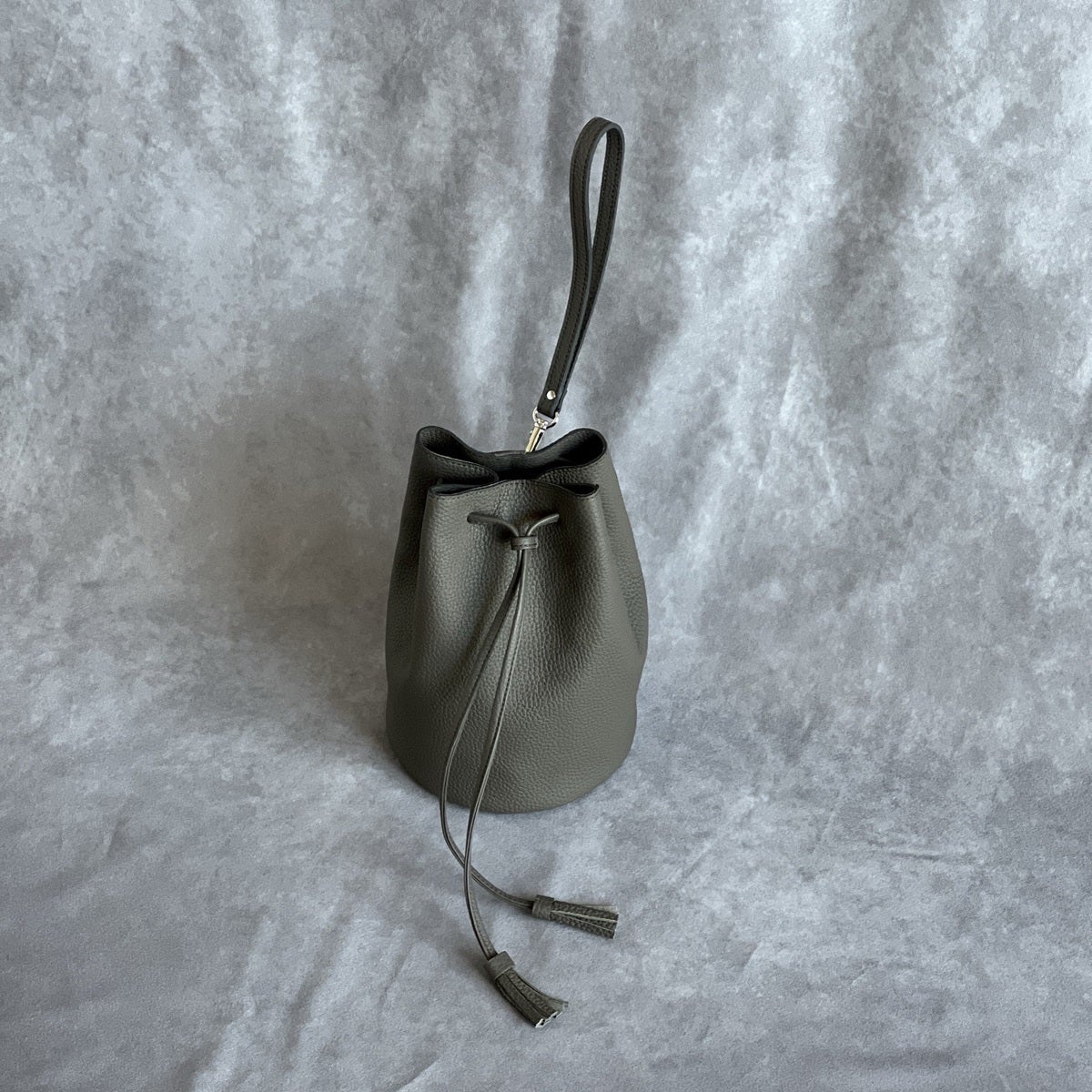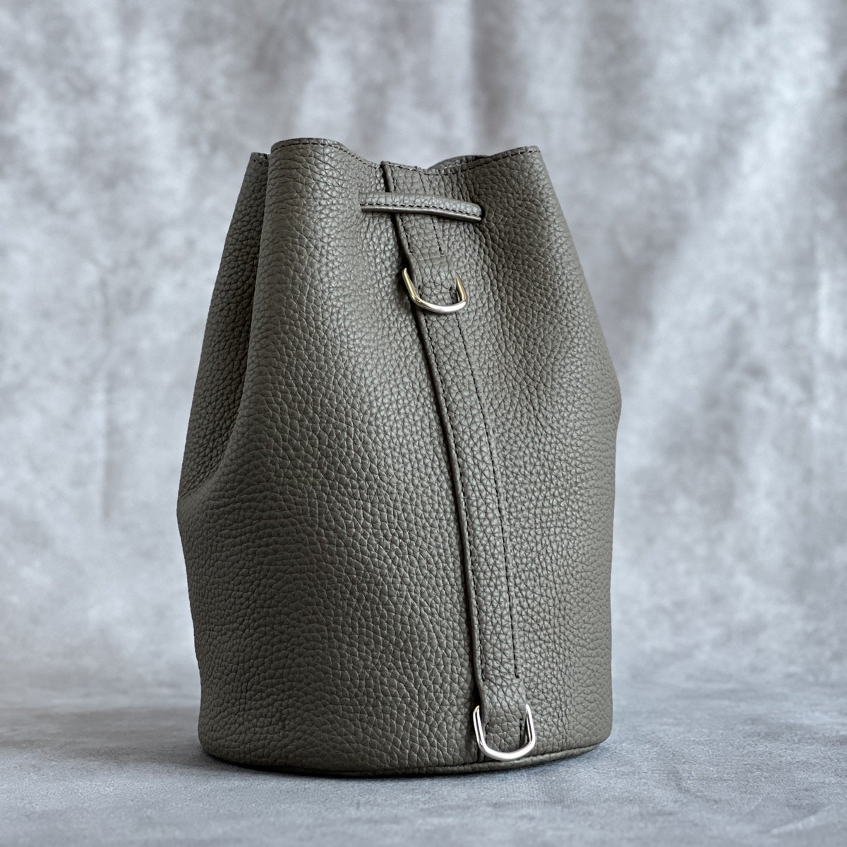 デザインは余計な装飾を省いた、ミニマムなボンサック(巾着)タイプの小型バックです。