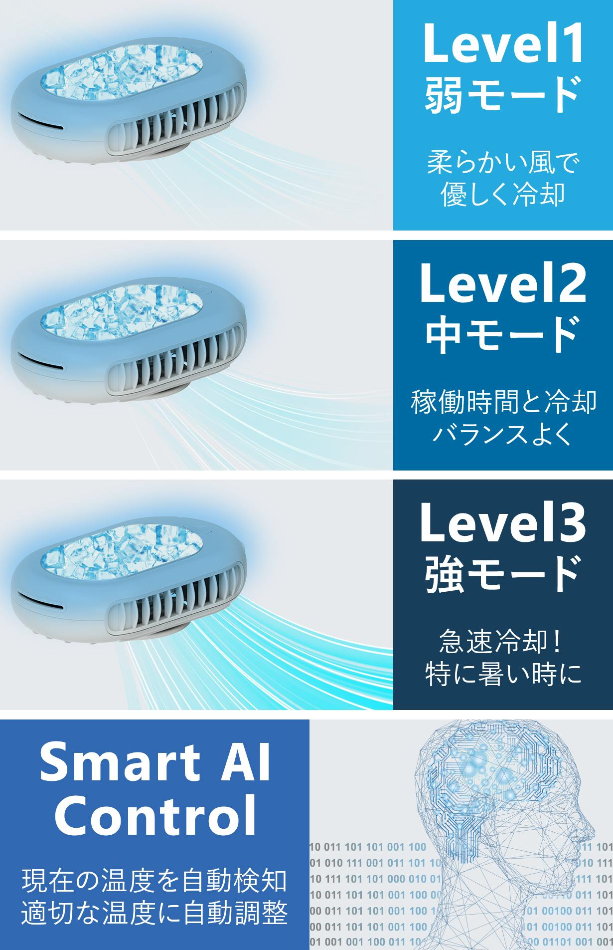 ハンズフリー・長時間使用可能・冷却機能で効率的に冷却します。