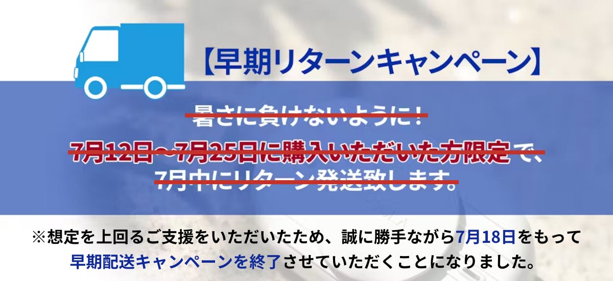 ※原則として、配送遅延に伴う支援のキャンセルはできませんが、リターン配送予定月から6ヶ月を超えた場合には、希望者に限あありキャンセルにて対応させていただきます。