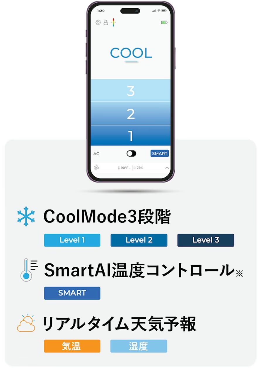 またアプリ(iOS / Android 両対応)で本体を触らずに設定変更も可能。屋内に入るときなどにサッと調整すれば、冷えすぎも回避できますね。>