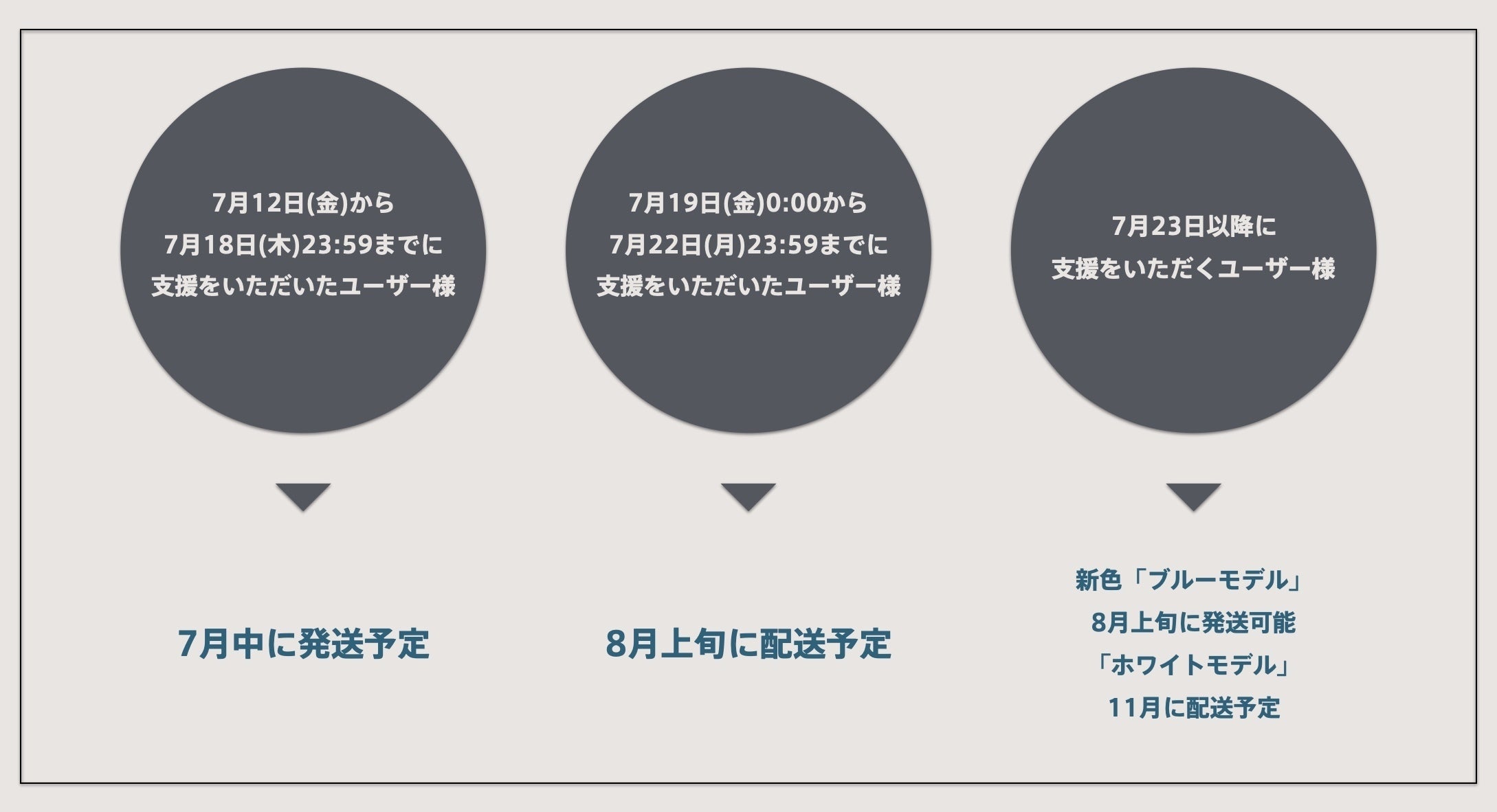 しかし想定よりも多くの支援をいただいたため、7/19(金)〜7/22(月)までにご支援いただいた方は8月上旬ごろにリターン配送できるようメーカーと調整いたしました!