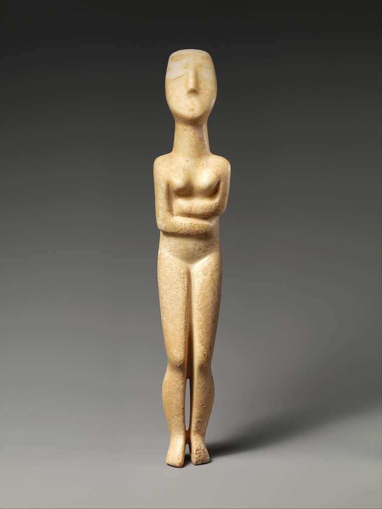 キクラデス文明は、紀元前3000年頃から2000年頃に、現在のギリシャにおいて栄えた文明です。そこから出土したキクラデス彫刻はその現代的な美しさから、20世紀半ばに個人収集家たちに注目され高く評価されるようになりました。