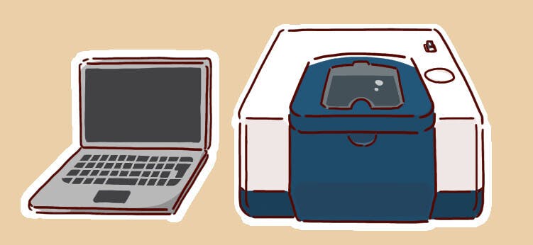 上の画像は分析器のイメージ(IR測定装置のイラスト)とトマトの芽です。