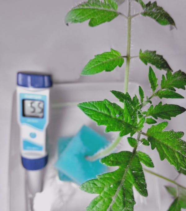 2024/05/27 10:26昨日、プロジェクト達成祈願で苗を植え替えました。苗用ポットを使うべきところ台所用のスポンジを使いました。手作り感がたまらなくいいですね!ロックウールを使うとpHが7.0に整えられお手軽だったのですが、台所用のスポンジを使うとトマトの最適値範囲とされている5.0〜6.5に下げられることが概ね確認できました。今朝確認してみたところ元気に根が伸びてました。トマトは元気のようでなによりです。あーあ、どこかに溶液中の有機無機成分をいい感じに制御しておいてくれるなにか、ないかなー。追記 トマトの根を応援するため、溶液を一部工夫しました。また、計測器が違っていたので合わせて変更しました。測定精度は± 0.2 pHです。応援よろしくお願いします! もっと見る