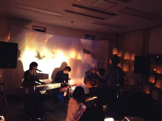 ライブ空間:ワークショップで作ってもらった家形ライトを空間に置いてライブを楽しんでもらう。沢山の家が集まることでひとつのホームタウンが完成する。