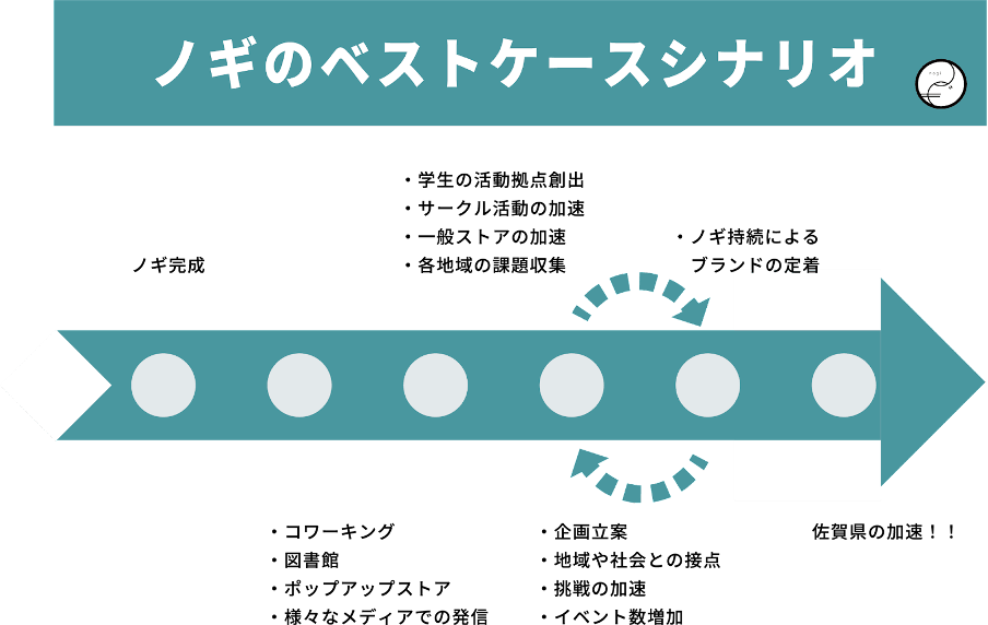 ノギという場所から佐賀の学生の活動、挑戦の場生み出し、学生の活動を加速させます!そして、その活動は必然的にノギを通って、地域に還元され、佐賀全体を加速させることでしょう。