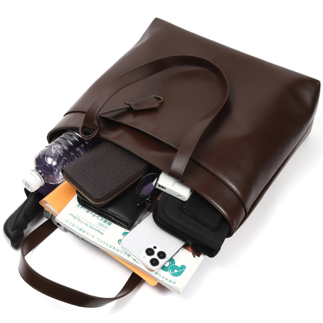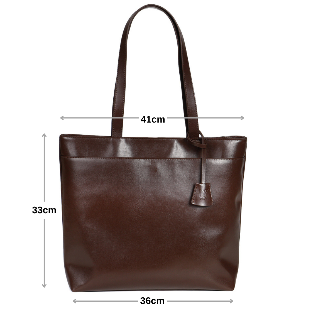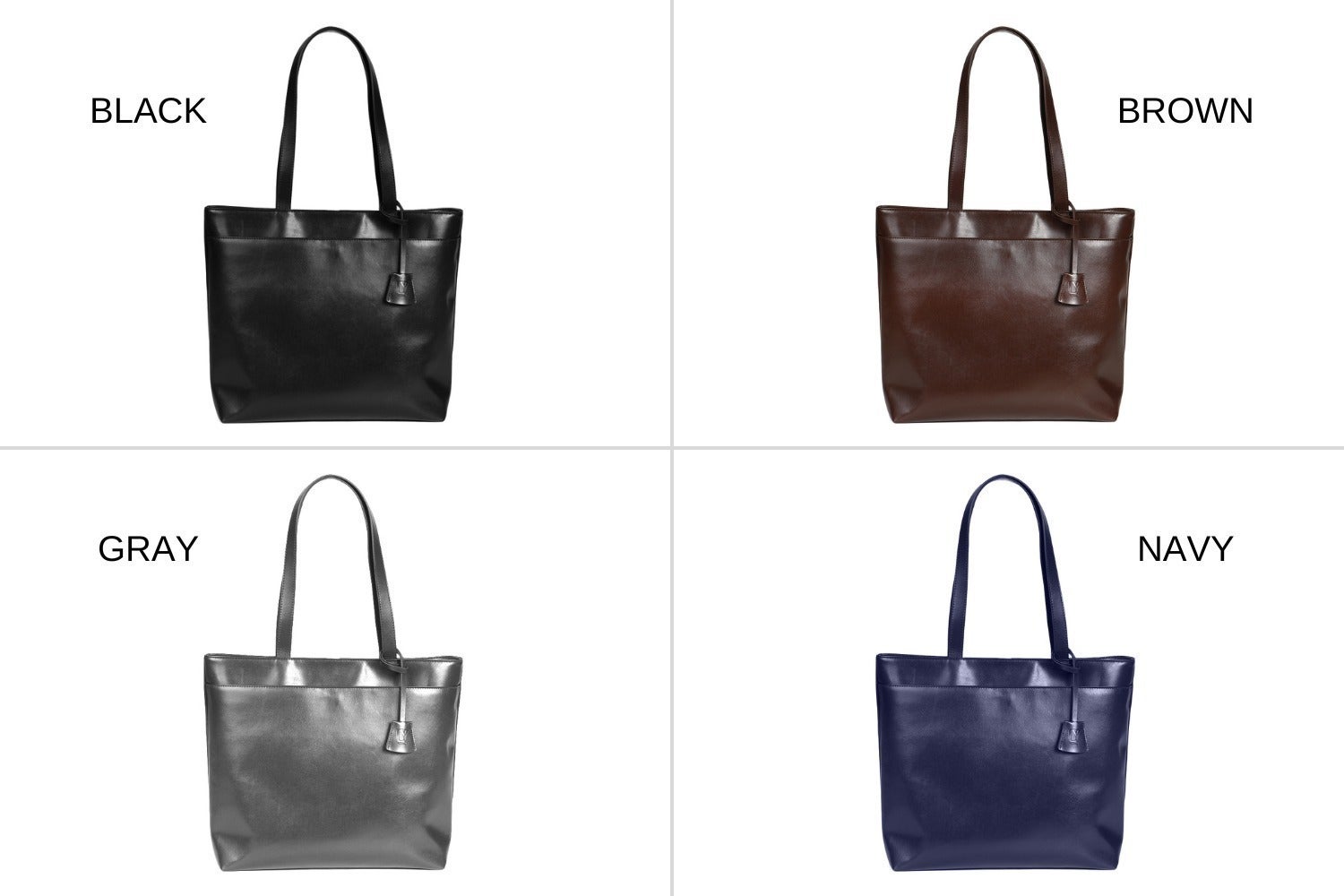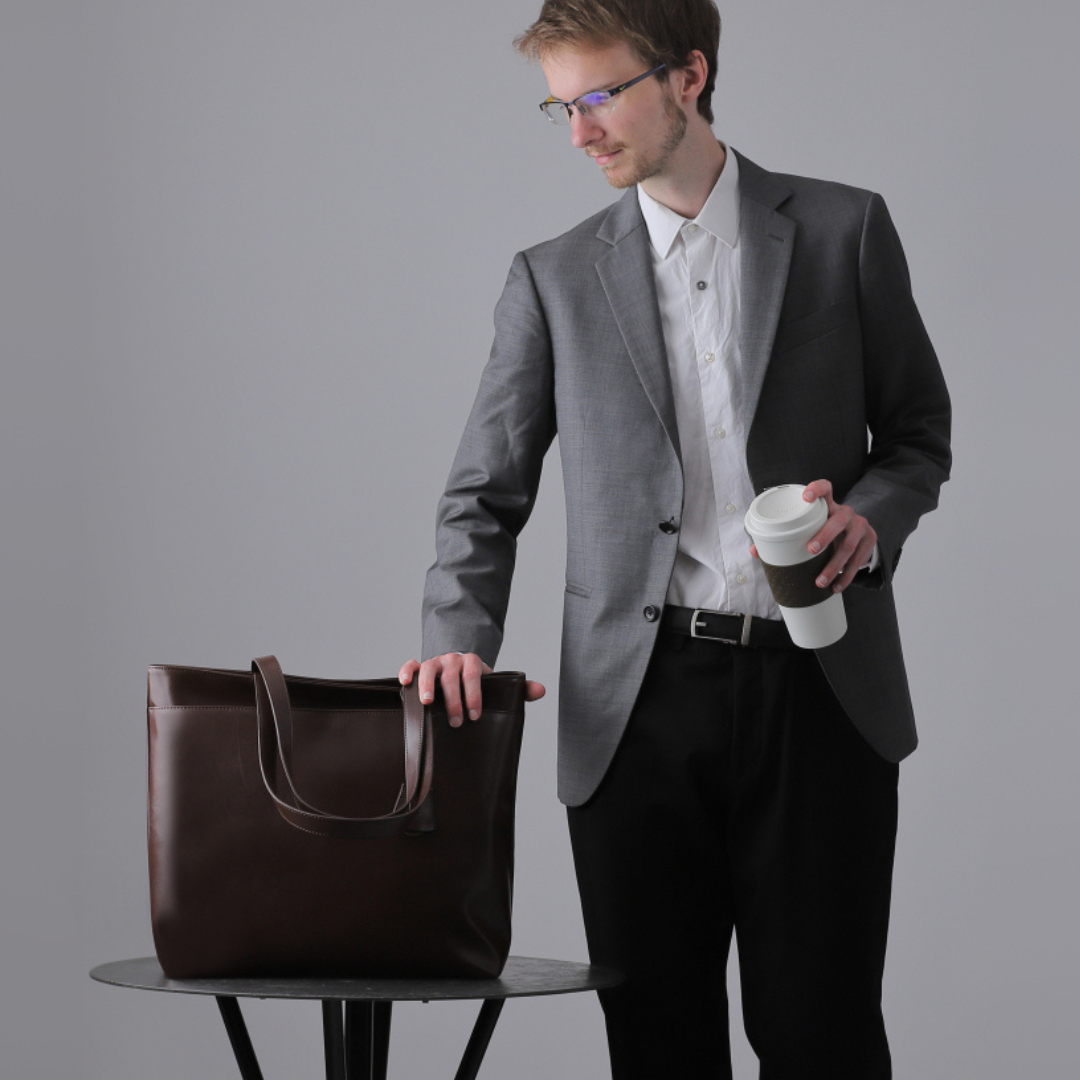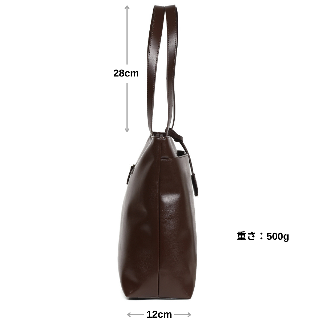 トートバッグありがとうございました。この価格でこのクオリティにびっくりです。皮でありながら軽くて光沢もあるので高級感もありました。また持ち手も長めなので冬場はコートを着てても、楽に肩掛けが出来ますし、持ち手が柔らかいので肩からずり落ち難いのもとても良いと思いました。本当に良い買い物をさせてもらったと思います。強いて言うなら私が小柄なせいか、手で持って坂道や階段を歩くと地面に擦ってしまいます。また電車で膝の上に乗せると高さがあるので乗せ難いので、高さが33センチではなく29センチぐらいになると良いと思いました。この高さでも書類やPCなどを入れても充分な大きさだと思います。