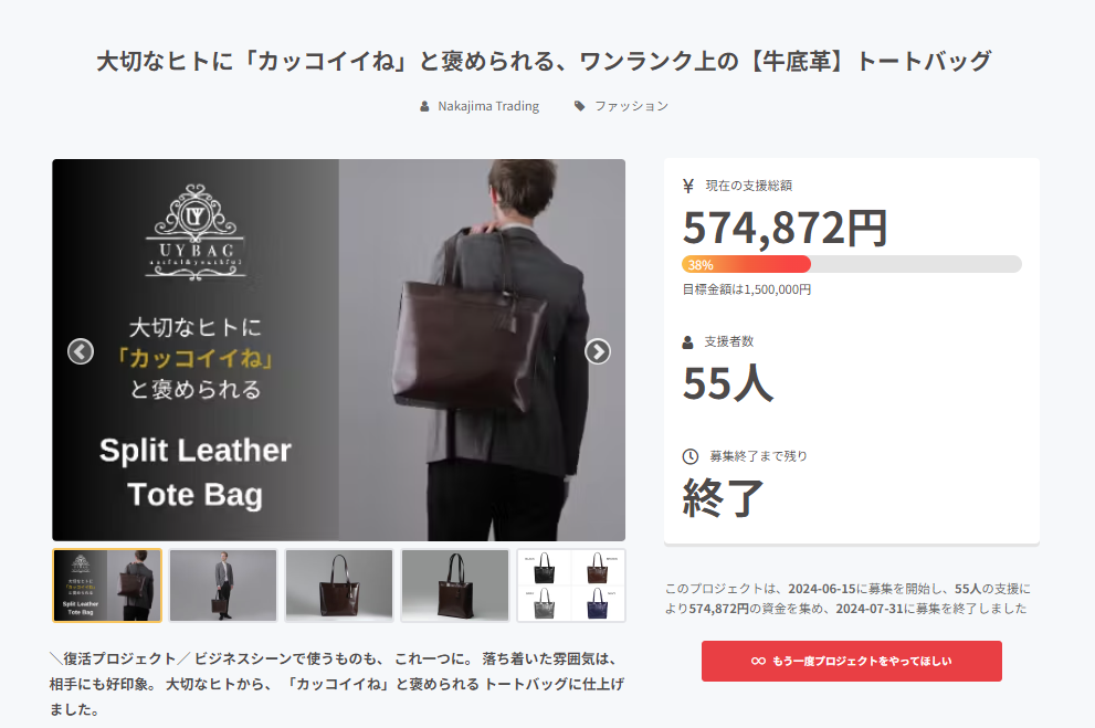 お世話になっております。プロジェクト担当の松岡です。『復活プロジェクト』大切なヒトに「カッコイイね」と褒められる、ワンランク上の【牛床革】トートバッグ先ほど、提携倉庫に入荷した在庫が反映されましたので、すぐさま発送手続きを行いました!お届け先によっては、早くて2-3日程度でお届けできる見込みです!当初のお届け予定日である11月上旬からは、数日の遅れが生じてしまいましたが、無事ここまで来れたこと、大変うれしく思います…これも全て、ご支援いただいた皆様のお力添え、またご理解の賜物です!支援いただいてから、ここまで長期にわたってお待ちくださり、本当にありがとうございました!今後とも、何卒よろしくお願い申し上げます!