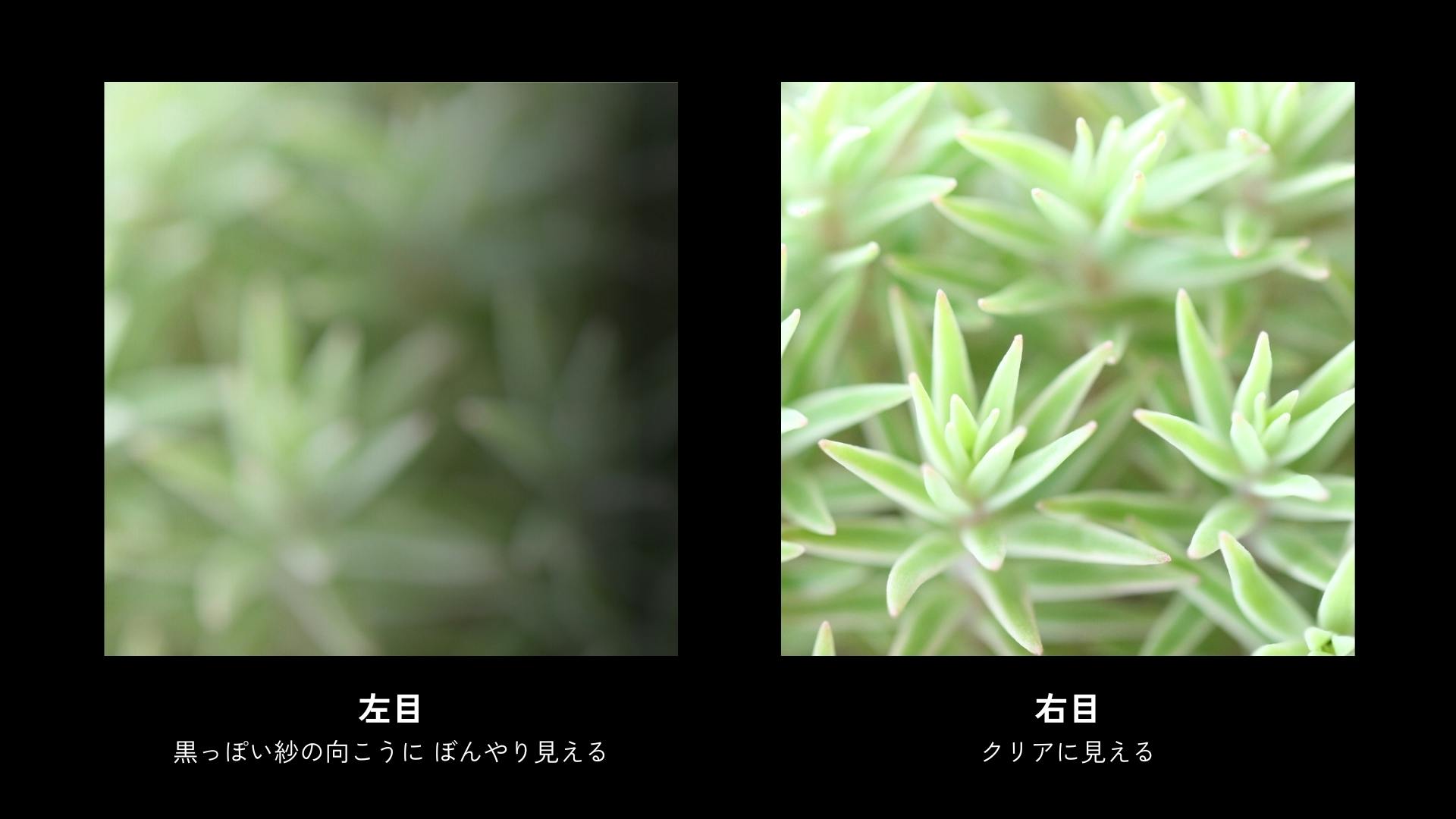 右目はクリアに世界をとらえ、左目はふんわりとぼやけた景色が、黒っぽい紗の向こう側に見えます。