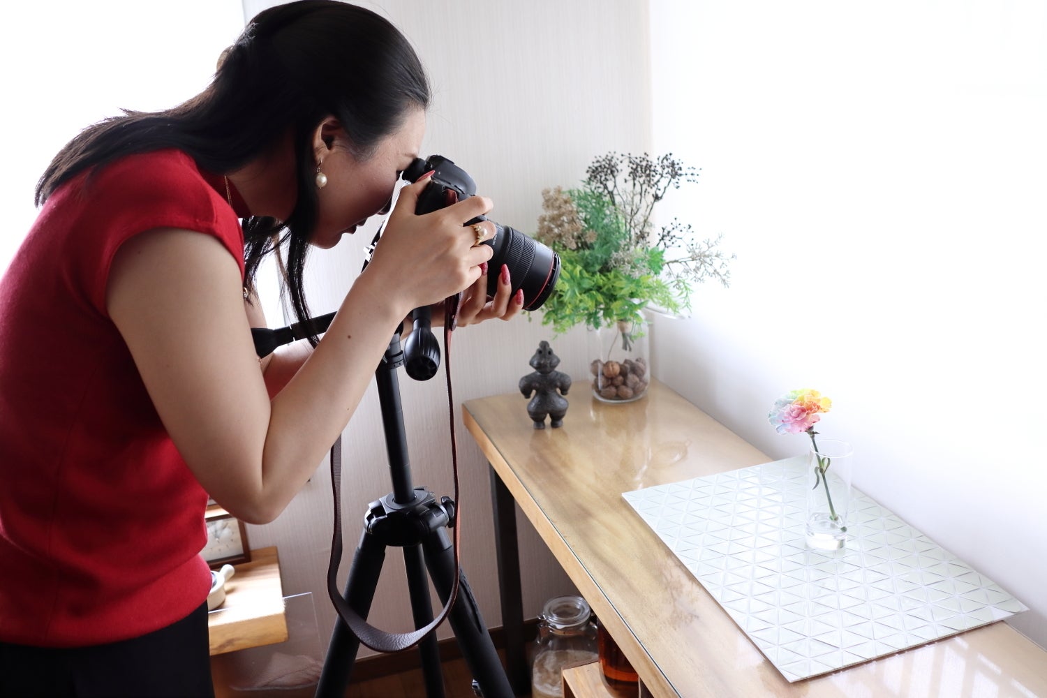 被写体となるお花を見つけたら、サロンでスクリーン背景に三脚などセッティングして、色々なアングルやテクニックで撮影していきます。