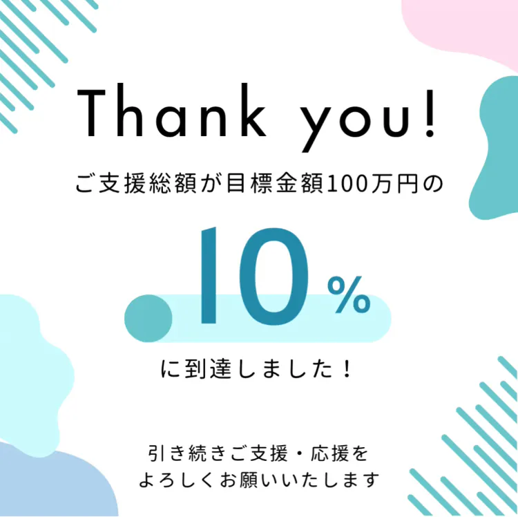 プロジェクトを公開してまだ間もないですが、複数名の方にご支援いただき、目標金額100万円の10%を達成することができました!!