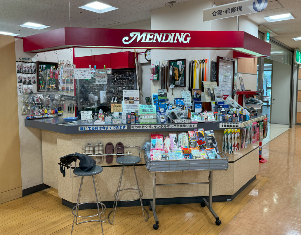 西武新宿線田無駅北口のペデストリアンデッキから直結するリヴィン田無の2階靴売り場の一角に、約30年間、メンディングは地域の皆さんの合鍵作成や靴・鞄修理のお手伝いをしてきました。