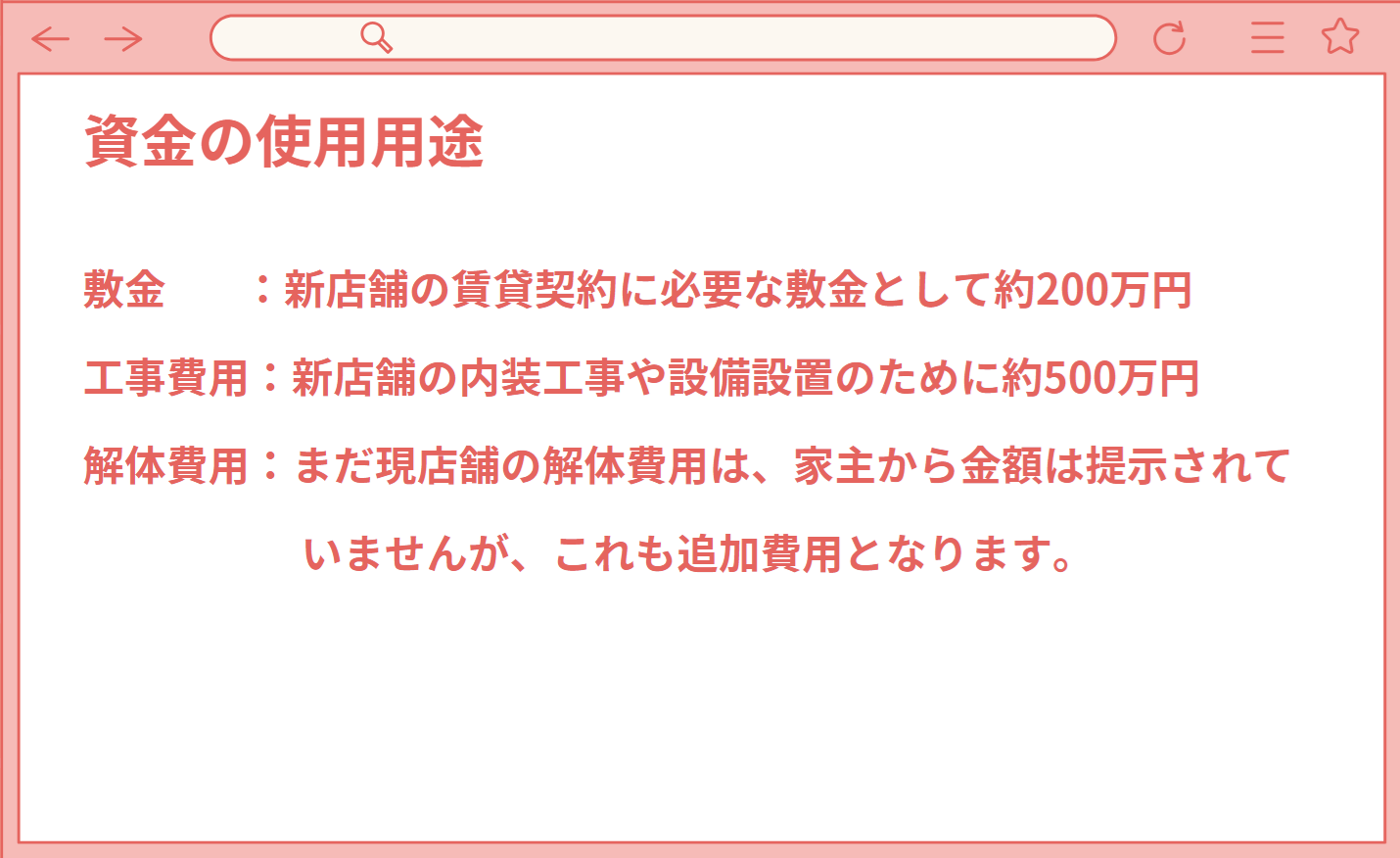 新店舗の移転には、総額で1000万円ほどの費用がかかると試算しています。 そのうちの500万円をゴールとして、皆さまのご支援をお願いします。