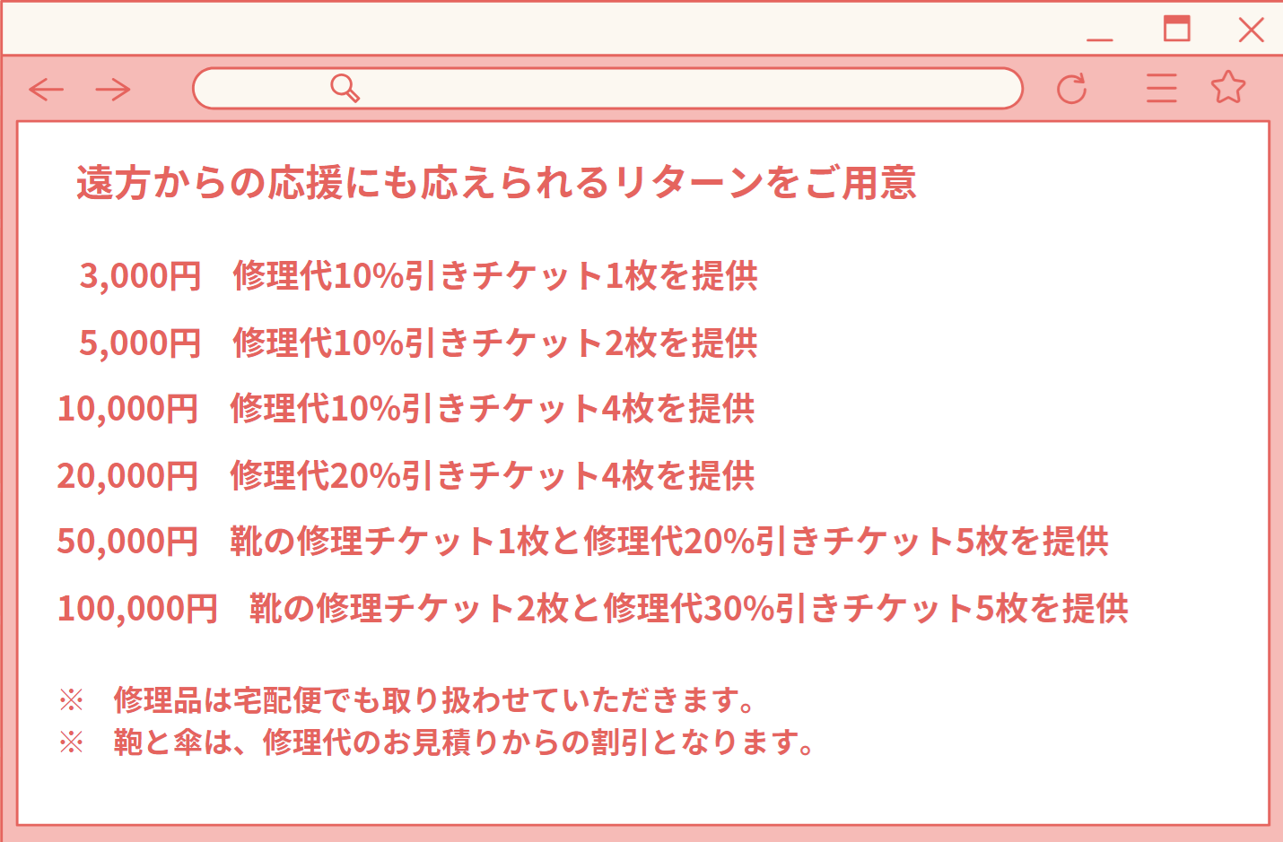 私たちのサービスは、地域の皆さんの支えがあってこそ成り立っています。 また、遠方の方もご利用可能なリターンも用意しました。 新しい店舗で再び皆さんの合鍵作成や靴・鞄修理をサポートし続けるために、クラウドファンディングでのご協力をお願いしたいと思います。