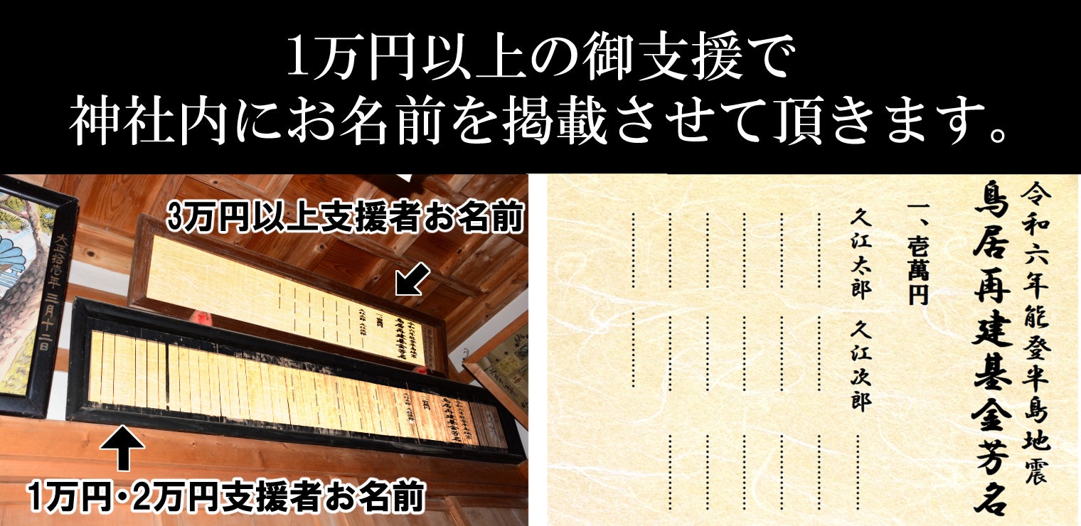 3万円以上ご支援頂いた方はもれなく再建する鳥居に名前・団体名等を掲載いたします。