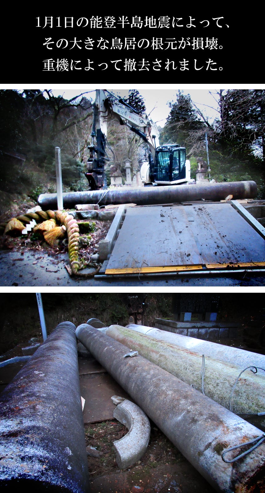 くてひこ神社も大きな被害を受けました。神社には高さ6m、幅8m、重さが14トンの大きな鳥居が立っていたんですが、この鳥居に亀裂が入りました。鳥居のすぐ下には人家があり、二次被害も想定される。そういった事も勘案し、鳥居を撤去するという形になりました。