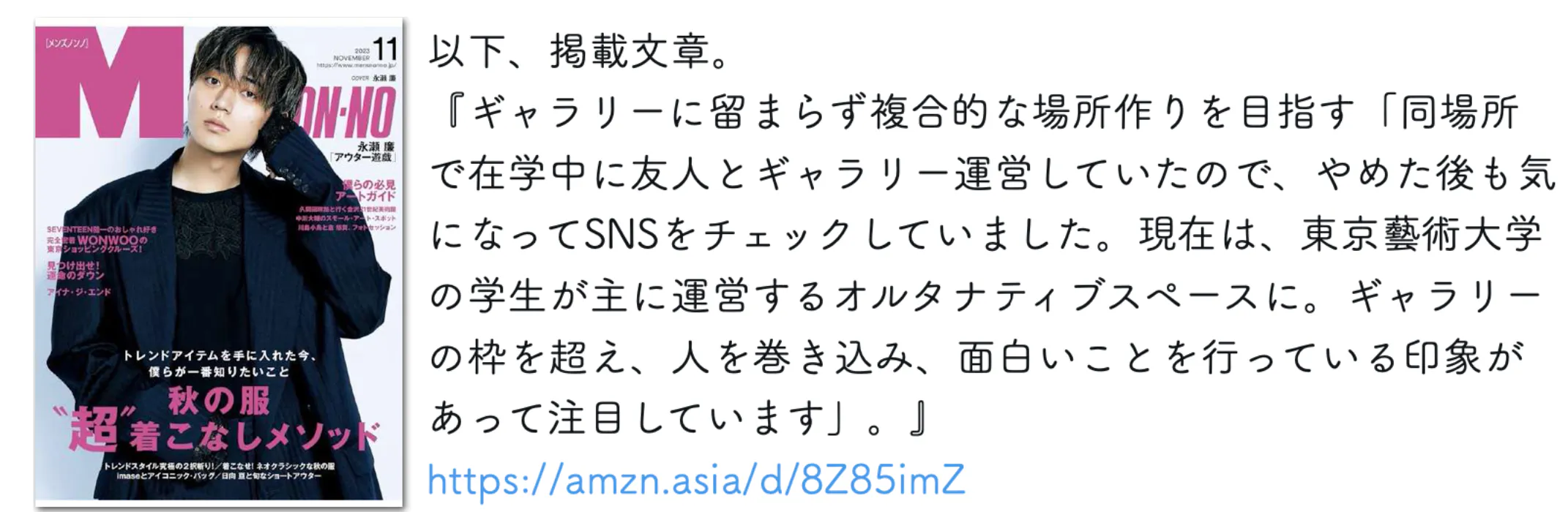 雑誌MEN'S NON-NO2023年11月号でHelloBee(現AVA)がキュレーターの髙木遊さんから上野・谷根千の偏愛スポットとして紹介されました。