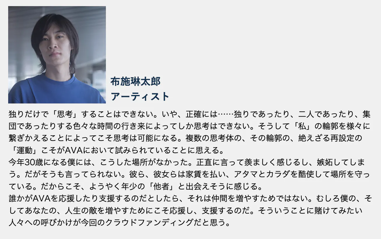 (現在、AVAはメンバーの自己資金で賃貸を借り運営しております。スペースを維持し、より活動を発展させるために資金が必要です。)