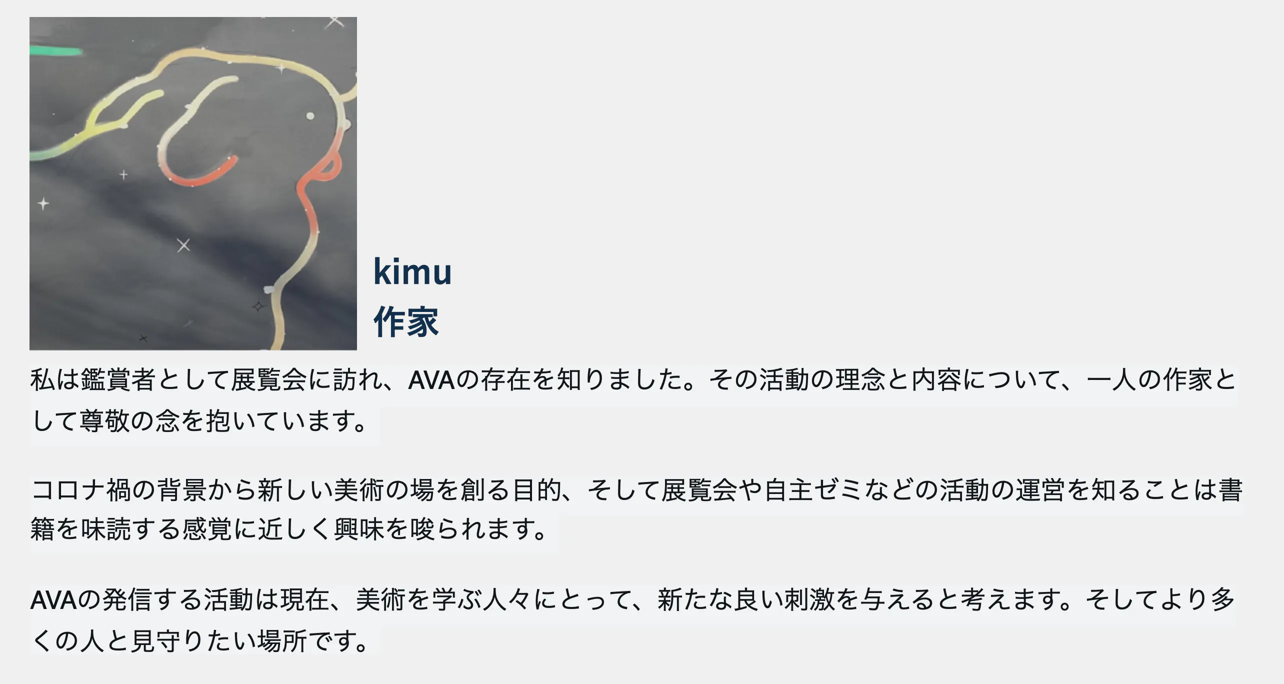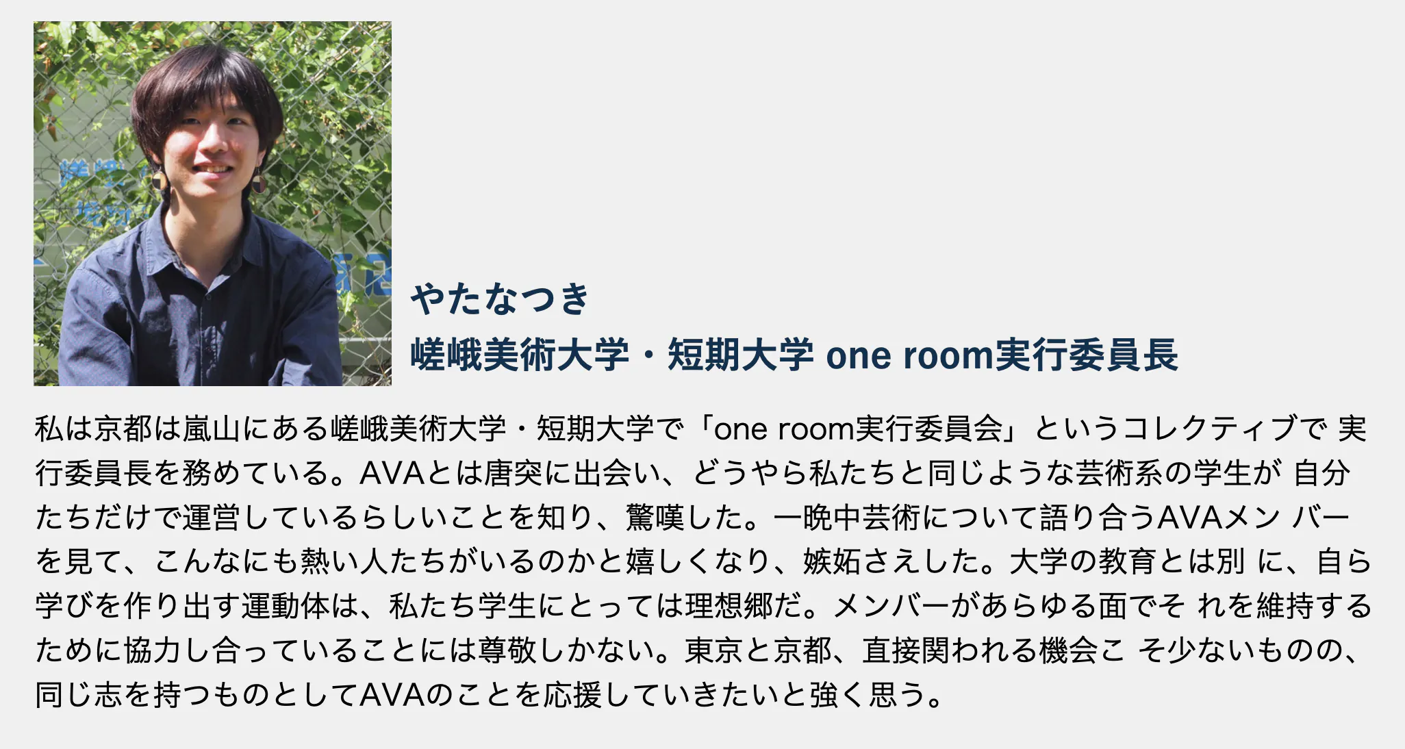 AVAは学生が主体となって運営しているコレクティブですので、各々の収入も少ない中で互いに協力し合いながら手探りの状態で進んでいます。それでも芸術の持つ力を信じ、熱意と強い目的意識のもとで活動を広げております。