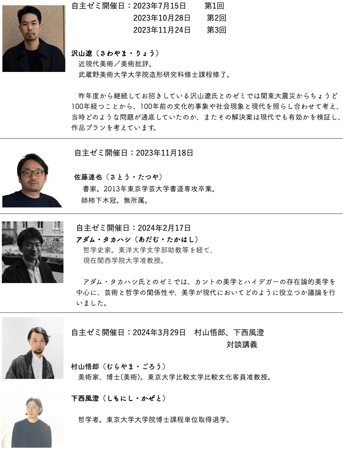 これまで、私たちは新しい視点から芸術の理論を語るために、美術批評家や哲学者、言語学者などのメンターをお招きして、閉ざされた少人数のコミュニティで勉強会「自主ゼミ」を行ってきました。