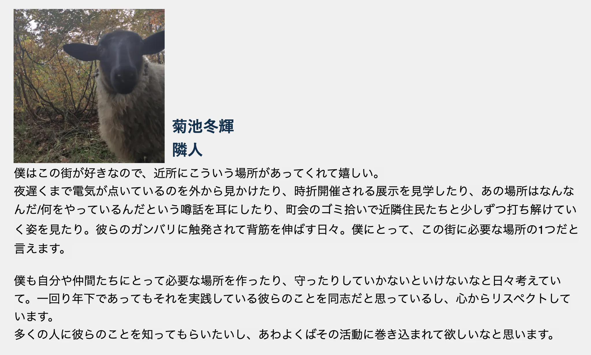 これらの活動が、新しい文化の形成の一助となっていると考えていますが、今後はその文化をさらに広げていく必要があります。具体的には、地方で活動する団体や、海外のアーティストや研究者との交流を通じて、新たなネットワークを構築していきたいと考えています。