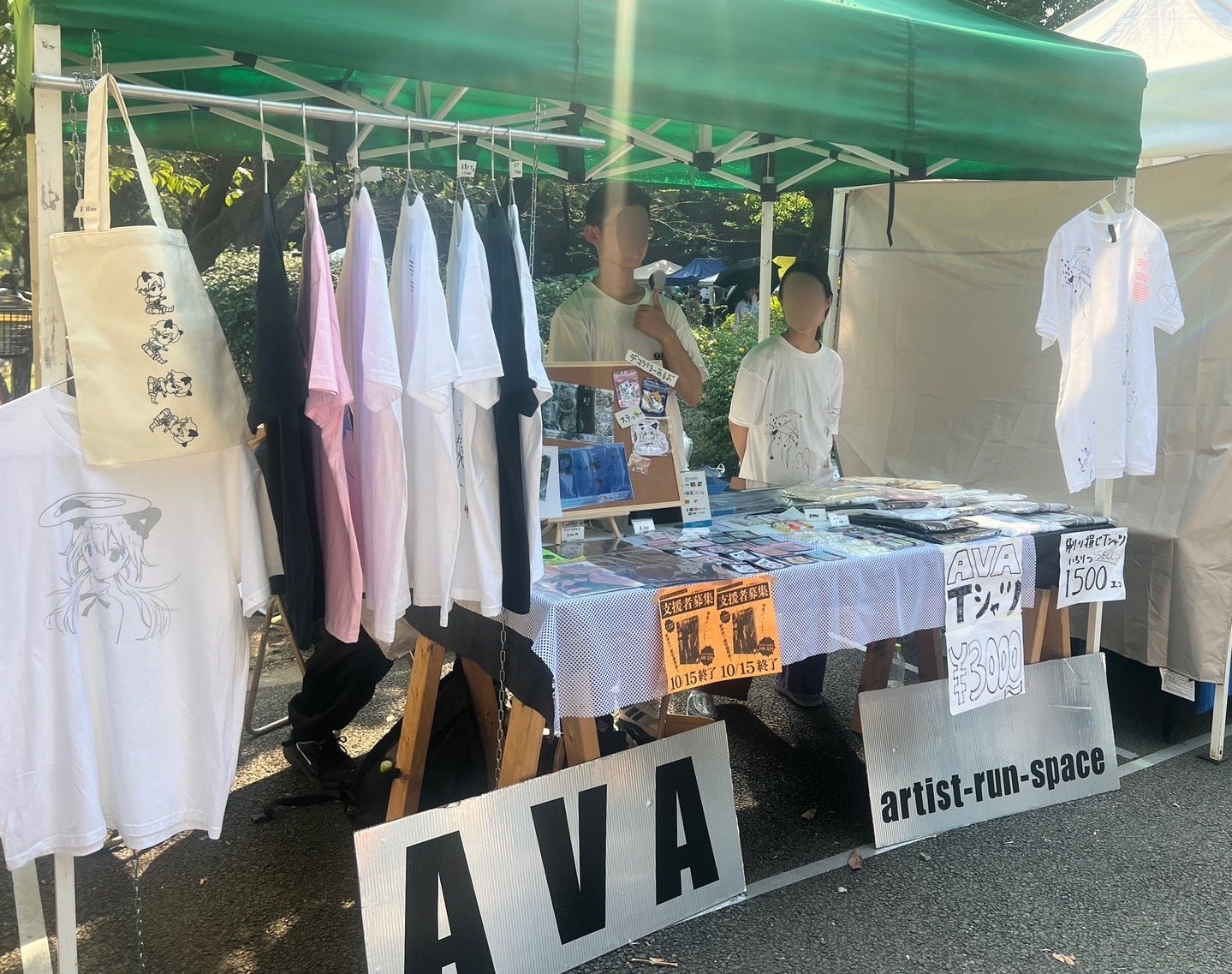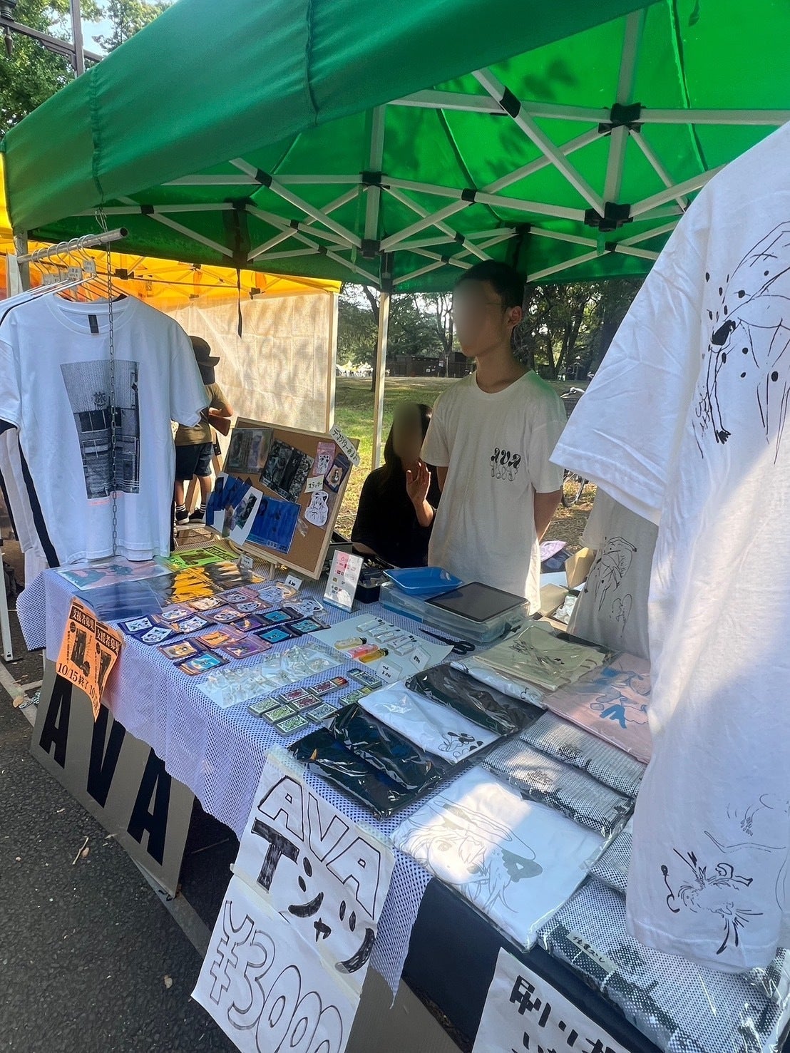 アトマでは、シルクスクリーンで手刷りしたTシャツ10種類をはじめ、AVAのキャラクターをデザインしたステッカー、オリジナルしおり、アクセサリー、ドローイング、マッチなど、様々な作品を出品しました。