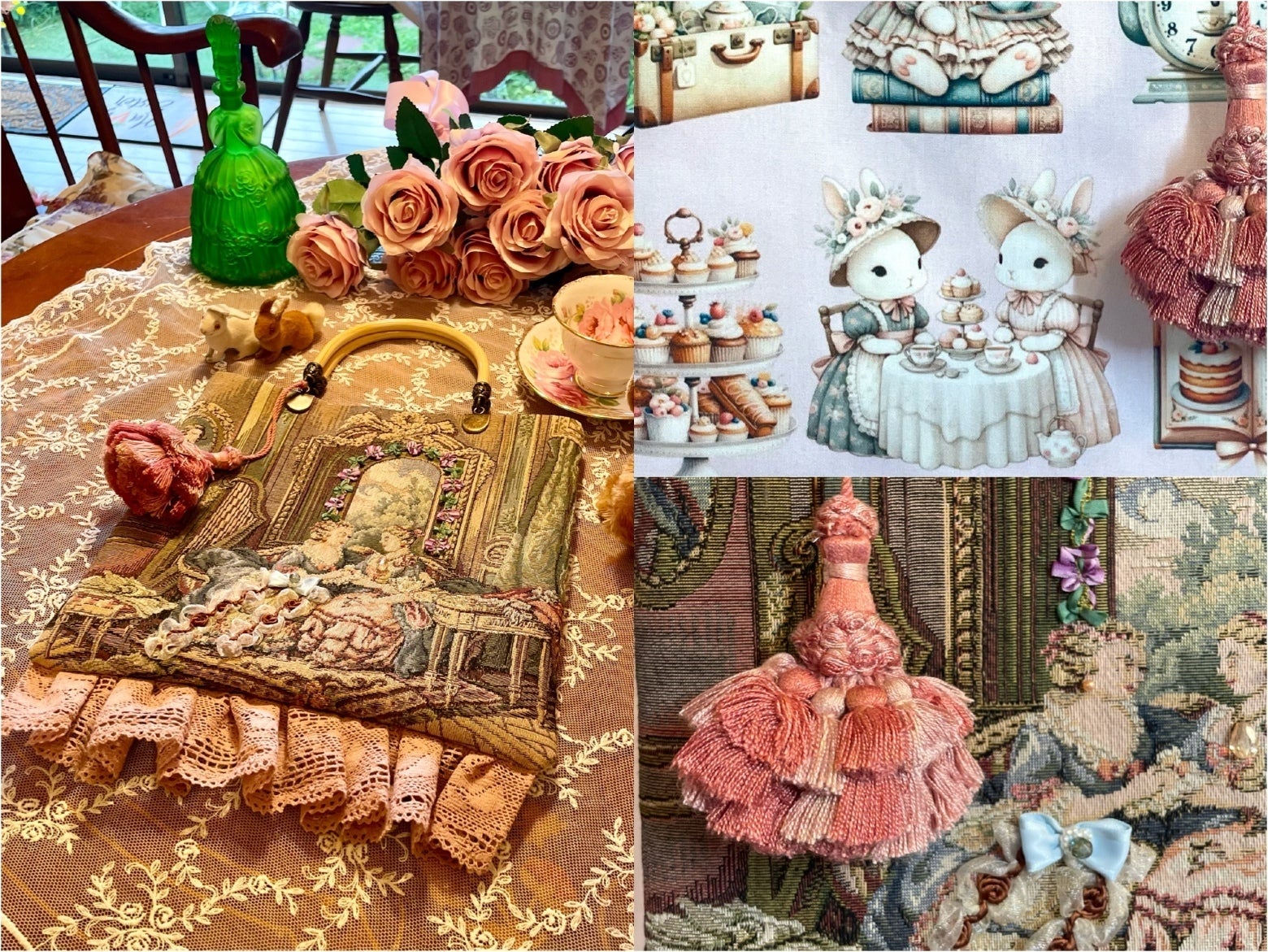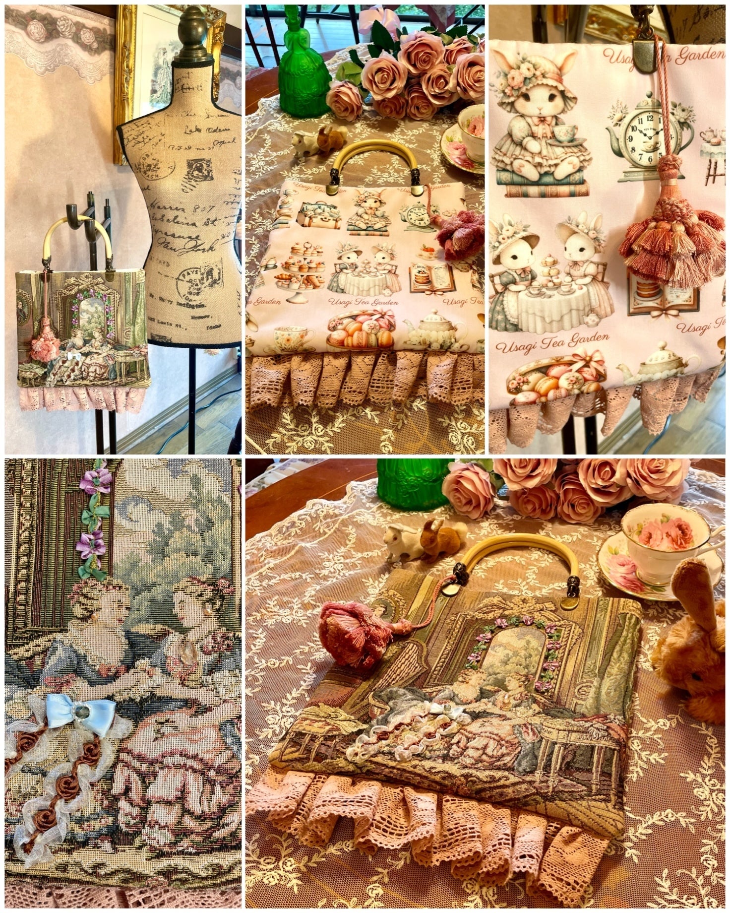 20年前にイタリア、フィレンツェにて沢山買い付けたゴブラン生地と、オリジナルプリント生地でハンドメイドしました。うさぎをテーマにした作品も今後は作ってゆく予定です!
