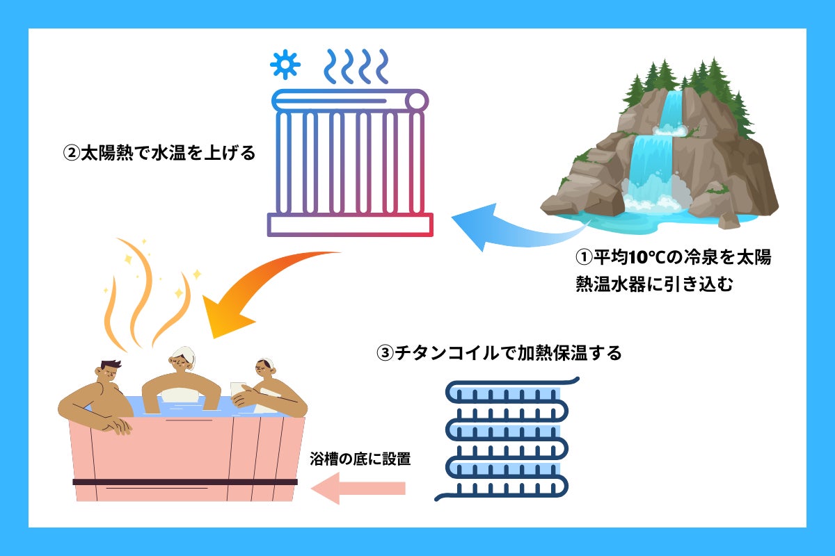 今回、太陽熱給湯器を導入したいと考えています。これは冷たい冷泉を温めるためのエネルギーを少しでも抑えるため、太陽の熱でまず温めます。天気さえよければ70℃くらいまで水温は上がるそうです。更にチタンコイルを浴槽に敷き詰め保温する事で、お湯が冷めるのを防ぎます。冷泉を沸かすガス器具の負担を下げ、ガス使用量を減らし、脱炭素を目指すシステムに変えていくという訳です。