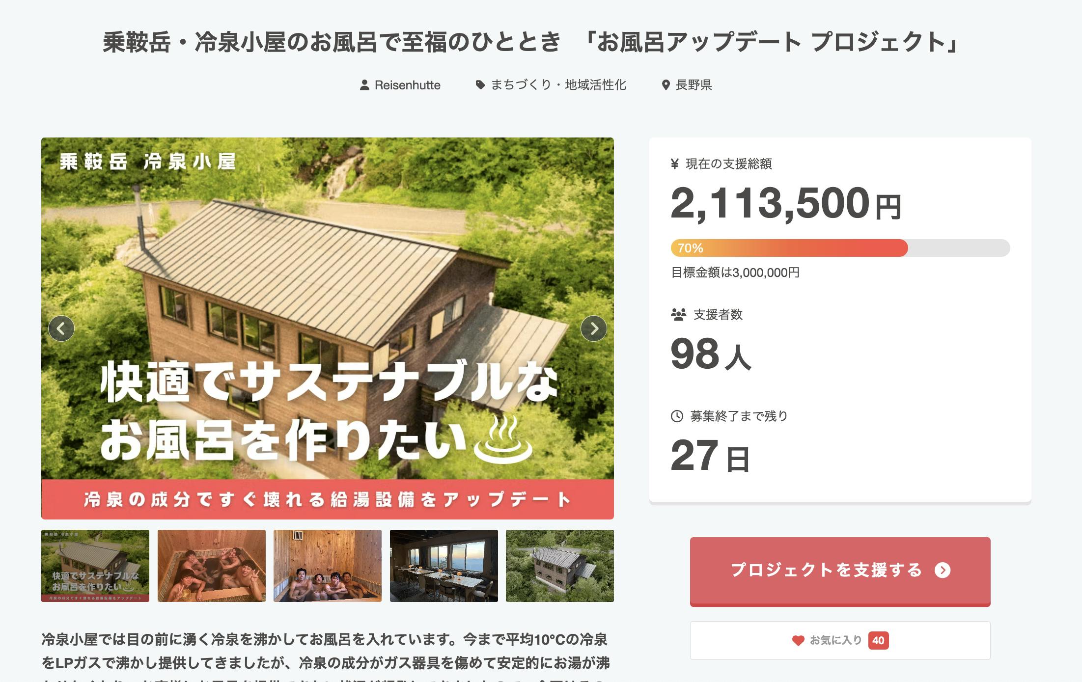 皆様こんにちわ。クラウドファンディング開始から約1ヶ月。目標額の90%を越え、支援してくださった方も130名となりました。皆様のご期待と多くのご支援に感謝申し上げます。ありがとうございます。クラウドファンディング終了まであと2週間となりました。ここで一気に加速して目標額を少しでも上回れたらありがたいと思っています。残り2週間もどうぞ応援やシェアをお願い致します。さて、既にご支援いただき、宿泊のリターンをお申し込みの方にご連絡です。宿泊予約はこちらのページより承っております。5/31(土)より毎週金土日が営業日となります。ご都合がいい日をご予約下さい。冷泉小屋の公式ホームページはこちらとなります。あと2週間となりますが、引き続き応援をどうぞよろしくお願い致します。シェアをしていただくだけでもとてもありがたいです!