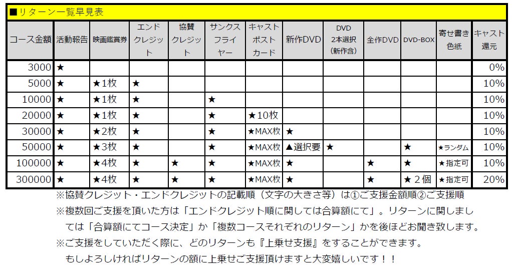 【リターン内容を文字で説明すると大変ややこしく申し訳ありませんが、基本は「映画鑑賞券」と「エンドクレジットにお名前記載」となります。そこから、コースアップごとにリターンが追加となっていく流れでございます。】