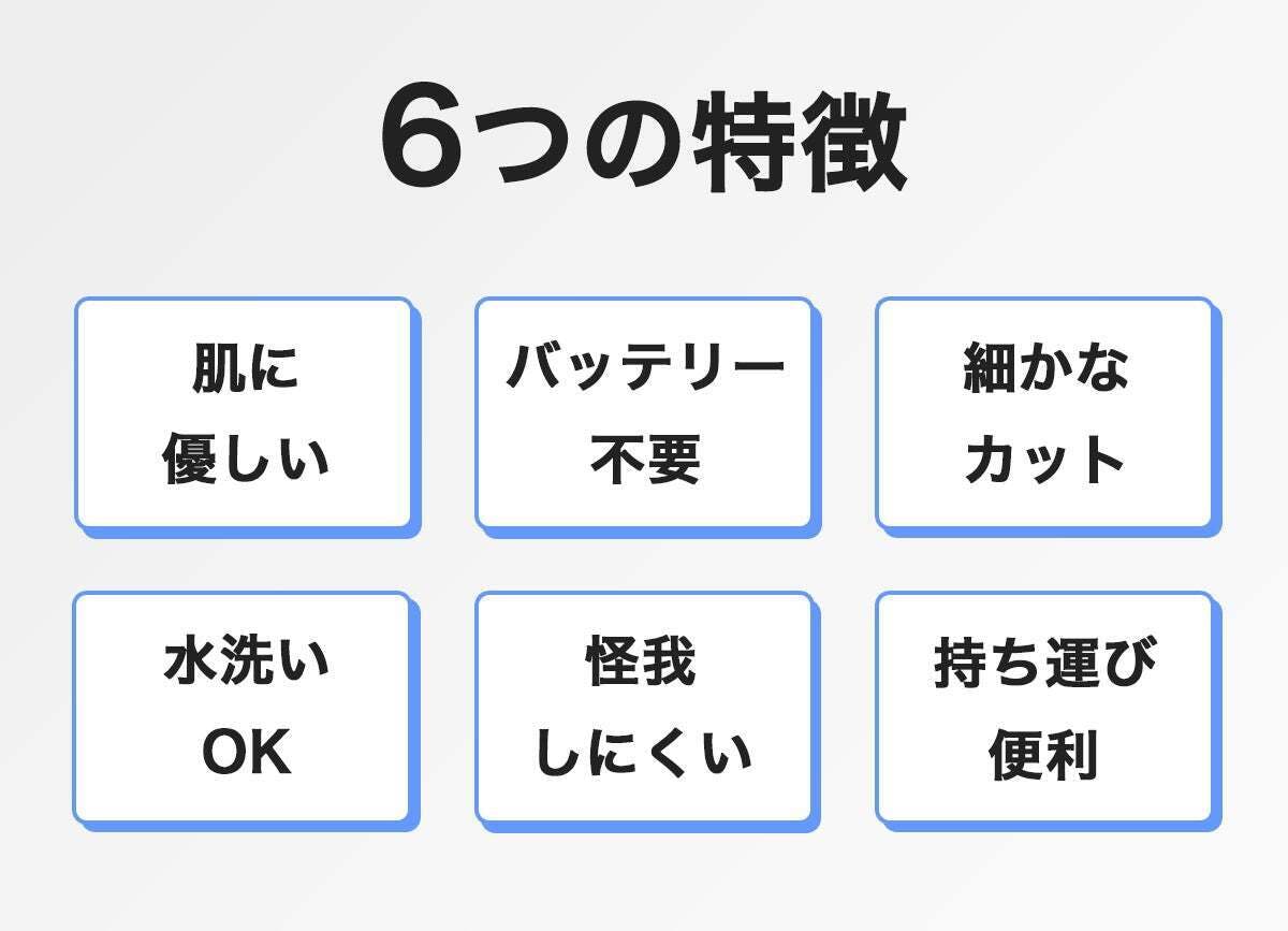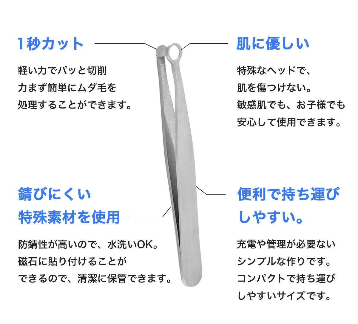 - 尖ってないのに、圧倒的な切削力!眉毛、耳毛、産毛など、あらゆる毛を楽々カット!