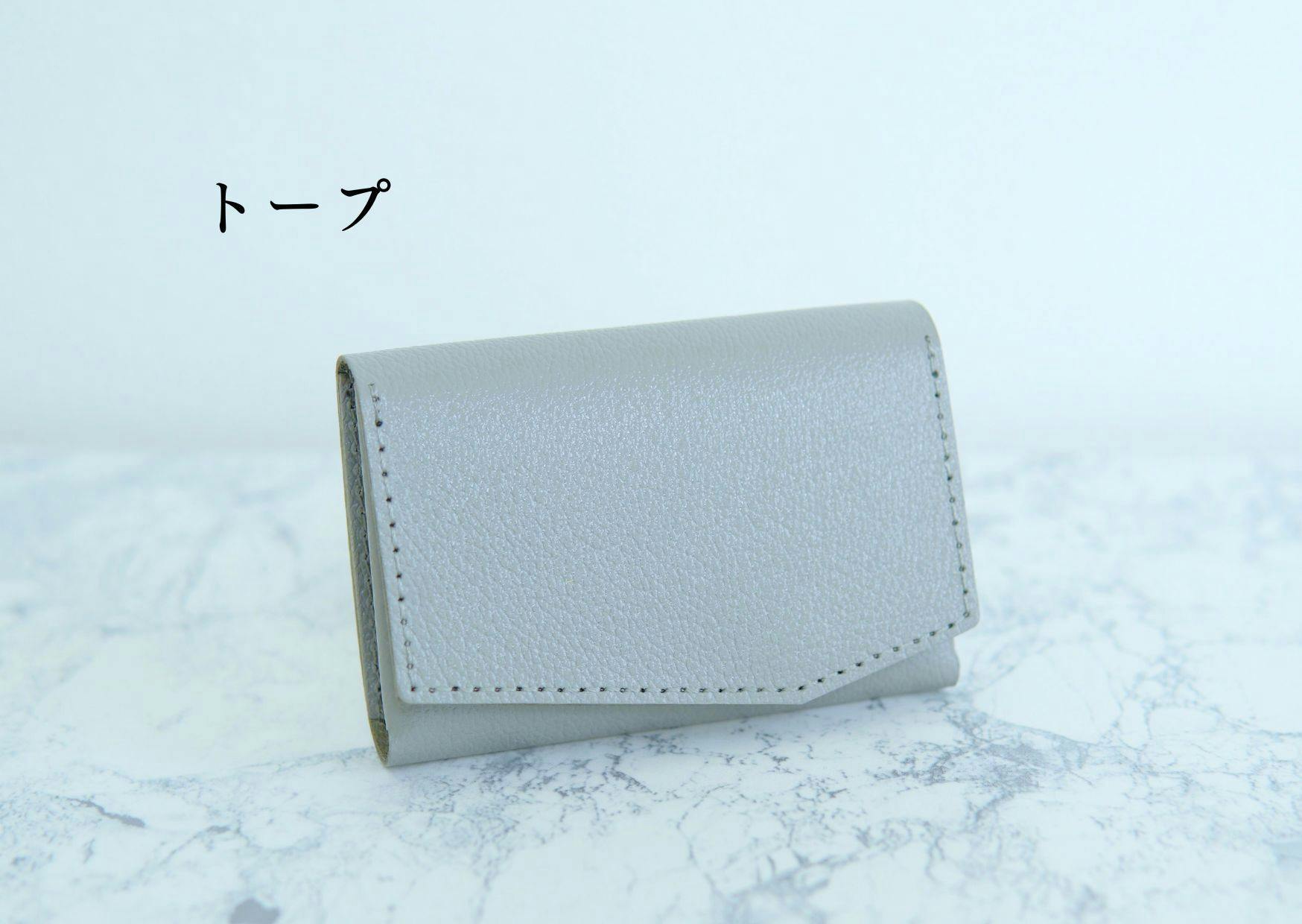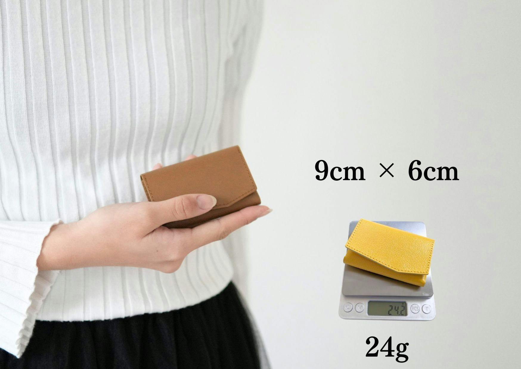 カード収納部のマチを縫わずに折り曲げ構造にすることで実現した、横幅がほぼカードサイズ(カード幅8.5cm、財布幅9cm)の極小財布。