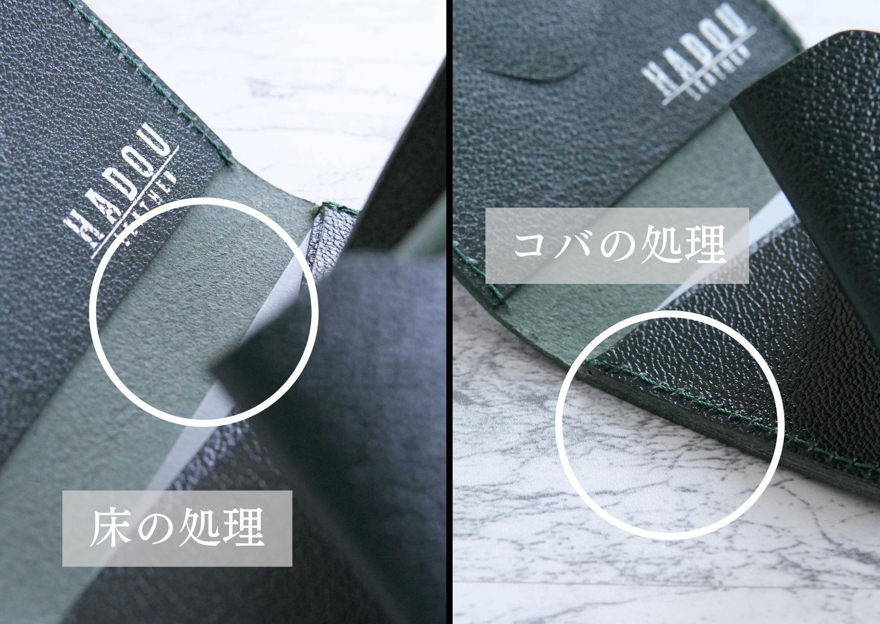 革の床(裏面)やコバ(革の断面)は素材そのままでは毛羽立って見た目が悪いことや、革自体の耐久性も悪くなります。床やコバを整える工程は手間と時間を要するところですが、細かいところまで品質向上に努めております。