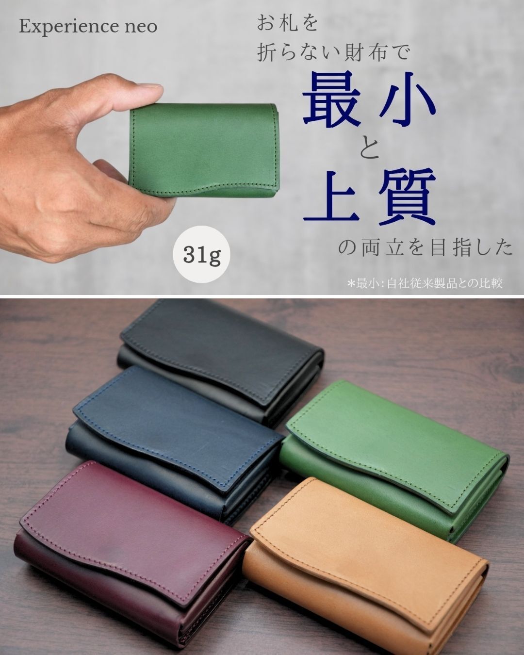 前作「Experience」をさらに進化させた自信作。キャッシュレス時代にフィットする極小財布を、より快適にお使いいただけるよう改良しました。