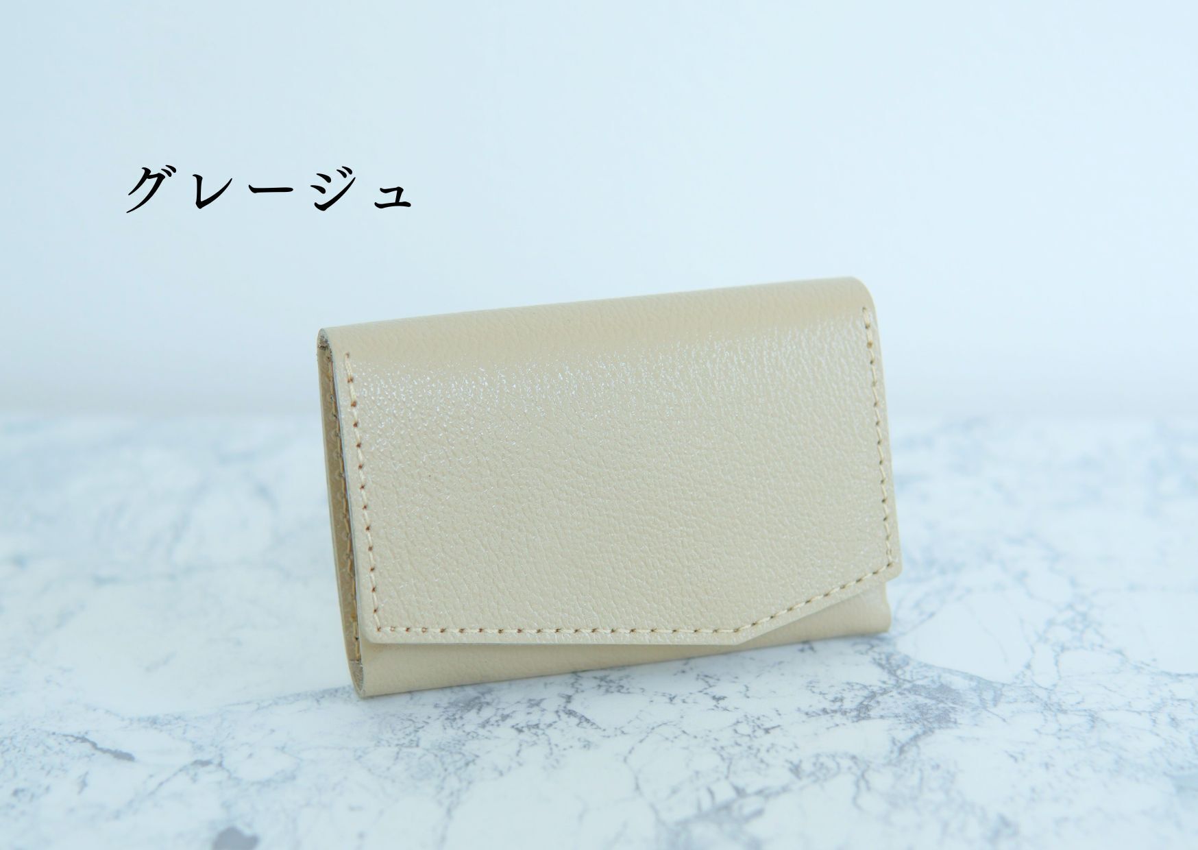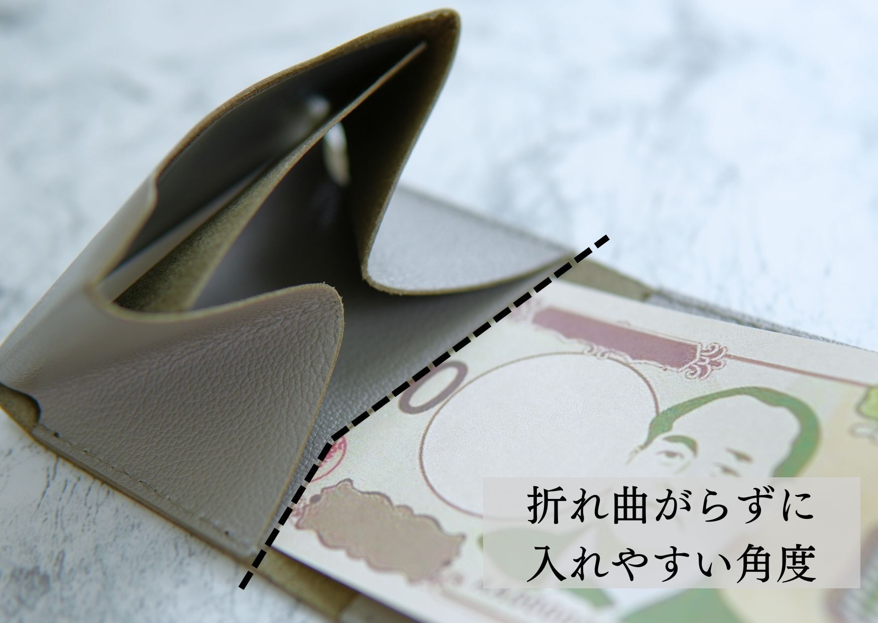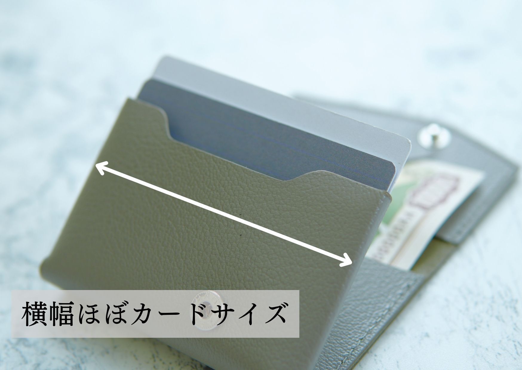 カード収納部のマチを縫わずに折り曲げ構造にすることで実現した、横幅がほぼカードサイズ(カード幅8.5cm、財布幅9cm)の極小財布。