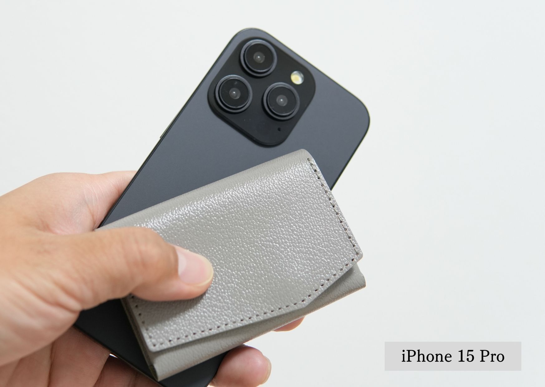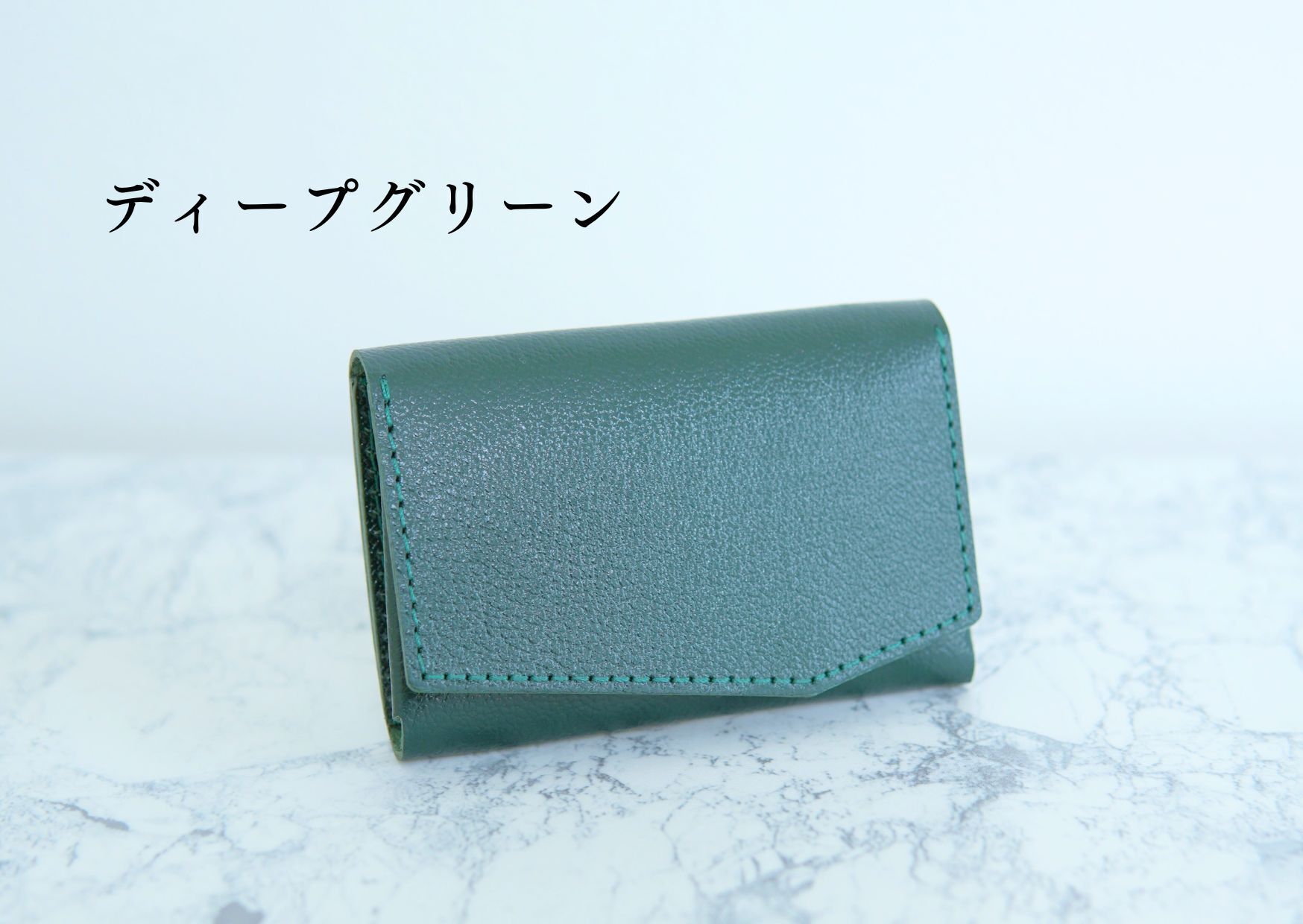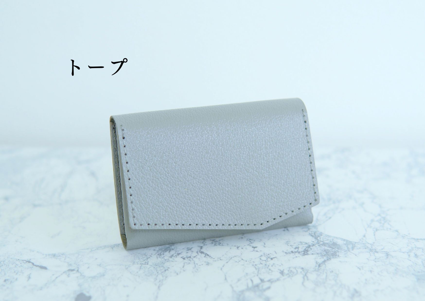 カード収納部のマチを縫わずに折り曲げ構造にすることで実現した、横幅がほぼカードサイズ(カード幅8.5cm、財布幅9cm)の極小財布。