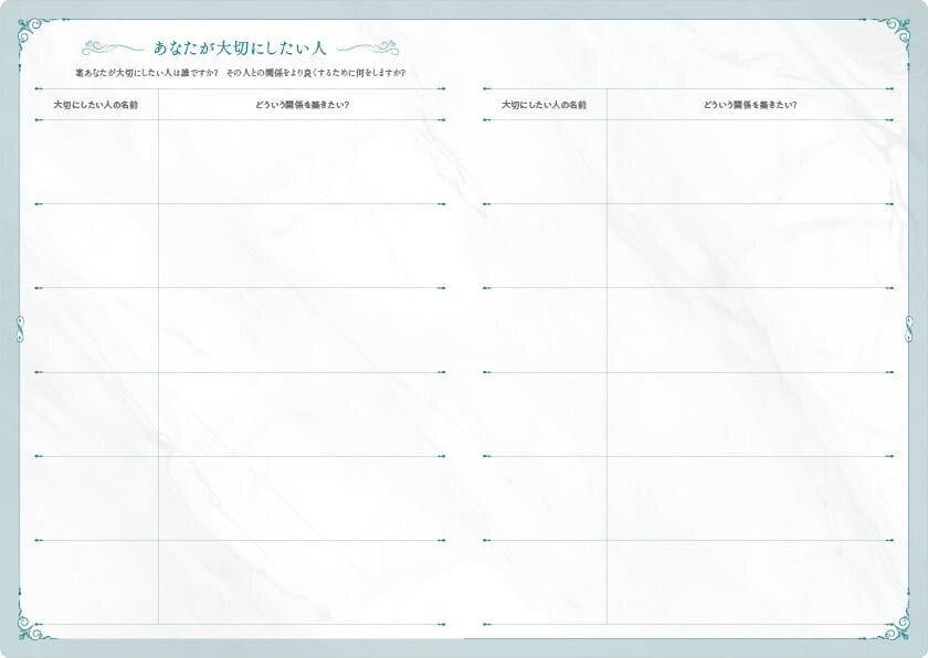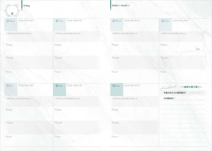 朝には、1日のマインドセットや「ごきげんになるためにやること」を記し、夜には「一番ハッピーだったこと」「感謝したこと」「自分を褒めること」を振り返ります。これにより、日々の中で小さな幸せや感謝を見つけ、自己肯定感を高めます。