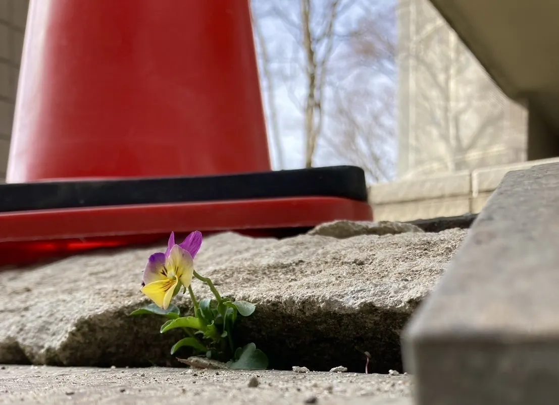 震災の影響で地面が割れたところから凛と咲き続けている花を