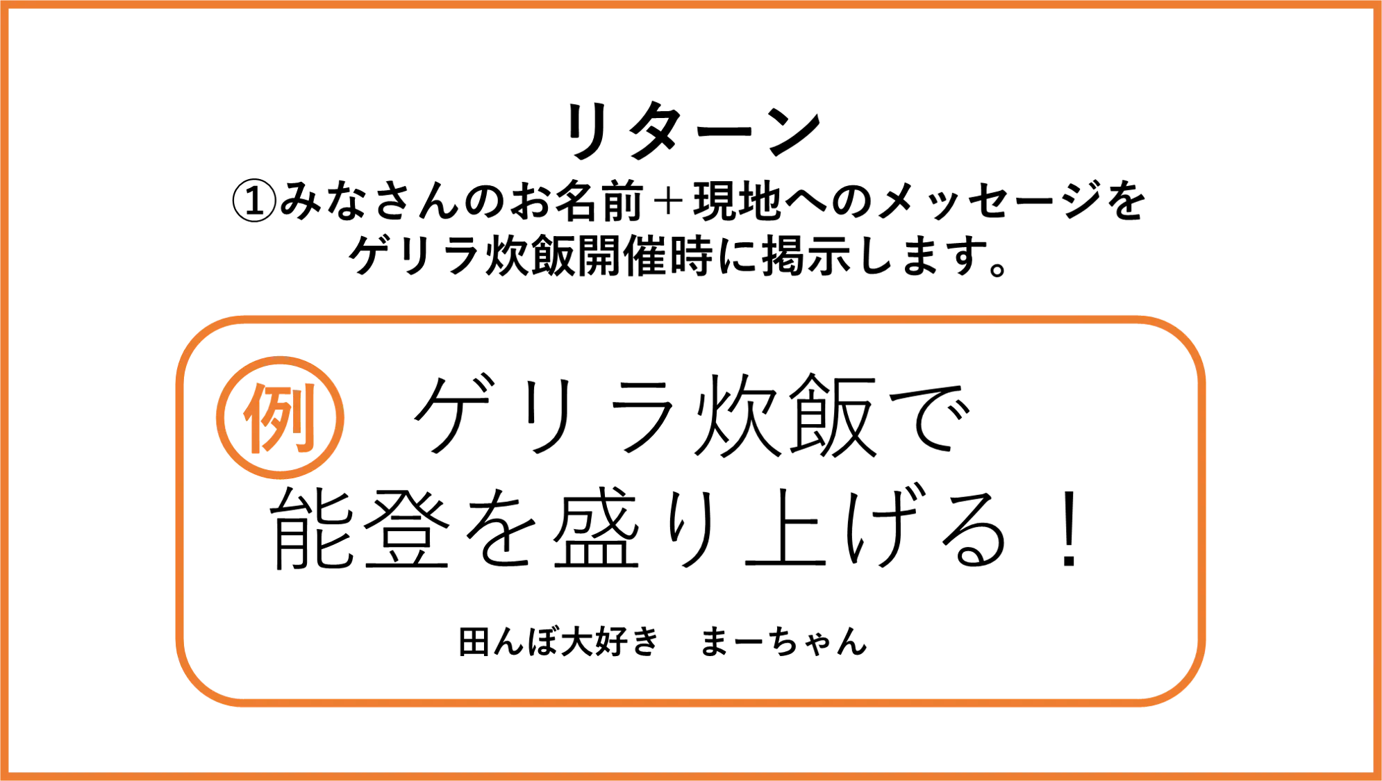 ①「お名前+現地へのメッセージをゲリラ炊飯開催時に掲示」